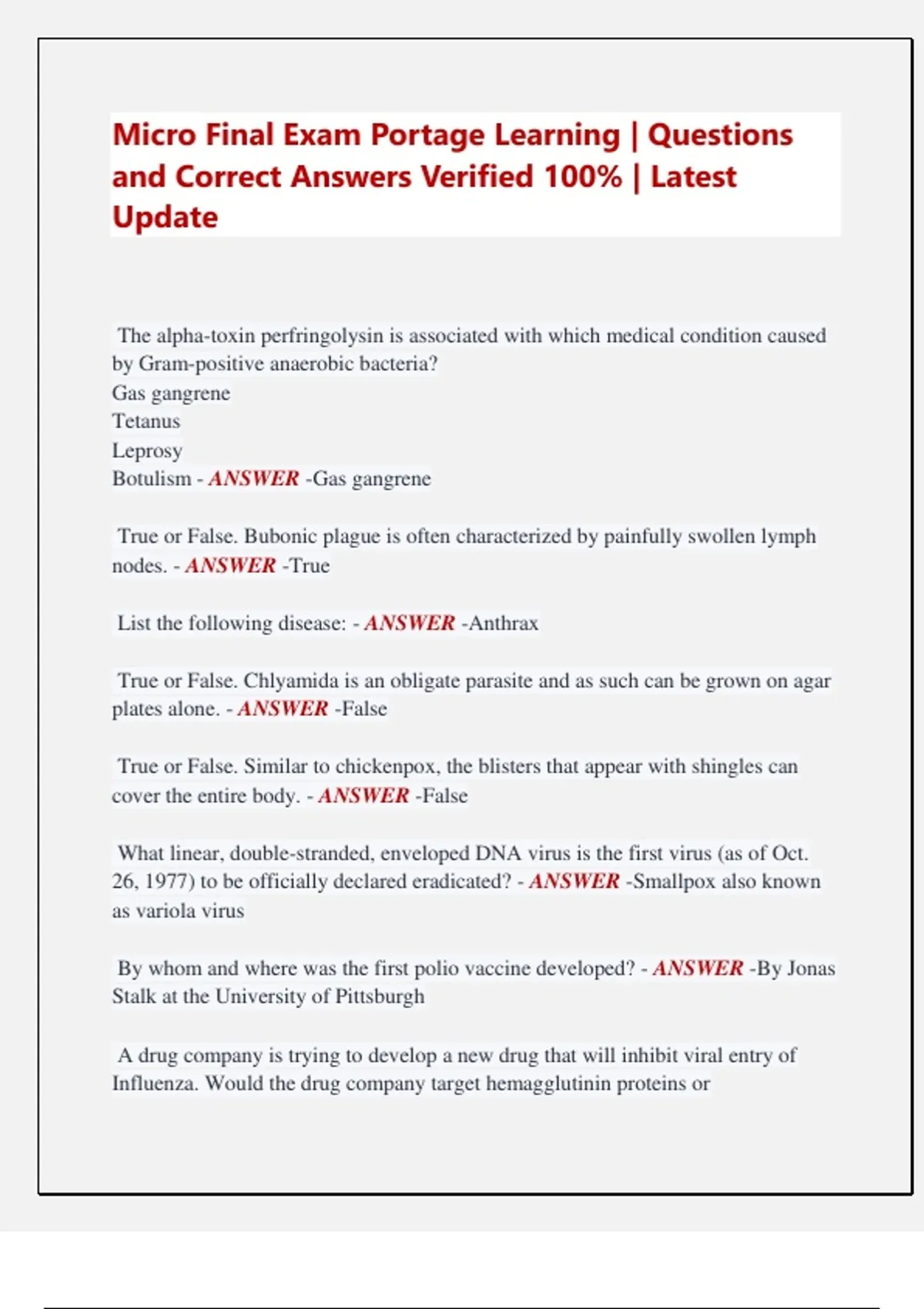 Micro Final Exam Portage Learning | Questions and Correct Answers Verified 100% | Latest Update The alpha-toxin perfringolysin is associated with which medical condition caused by Gram-positive anaerobic bacteria? Gas gangrene Tetanus Leprosy Botulism - ANSWER -Gas gangrene True or False. Bubonic plague is often characterized by painfully swollen lymph nodes. - ANSWER -True List the following disease: - ANSWER -Anthrax True or False. Chlyamida is an obligate parasite and as such can be grown on agar plates alone. - ANSWER -False True or False. Similar to chickenpox, the blisters that appear with shingles can cover the entire body. - ANSWER -False What linear, double-stranded, enveloped DNA virus is the first virus (as of Oct. 26, 1977) to be officially declared eradicated? - ANSWER -Smallpox also known as variola virus By whom and where was the first polio vaccine developed? - ANSWER -By Jonas Stalk at the University of Pittsburgh A drug company is trying to develop a new drug that will inhibit viral entry of Influenza. Would the drug company target hemagglutinin proteins or neuraminidase proteins? Why? - ANSWER -Hemagglutinins because hemagglutinins are involved in entry of viral particle into a host's cell. Whereas, neuraminidase is involved in budding and relase of the new viral particles from the host cell. True or False. The viral capsid of HIV is dumbbell shaped and contains ~2,000 copies of the viral protein p24. - ANSWER -False What small (~30nm) single-stranded, non-enveloped RNA virus targets the CNS (central nervous system), causing potentially catastrophic damage to motor neurons? - ANSWER -Polio (poliomyelitis) Which of the following are considered Protista? Select all that apply. Amoeba Algae Yeast Bacteria - ANSWER -Amoeba & Algae True or False: A defining characteristic of Protista is the inability of colonies to form tissue layers. - ANSWER -True The function of the ribosome is (select all that apply): Lipid synthesis Protein Synthesis Waste disposal via hydrolytic enzymes Protein modification and distribution To produce energy ATP - ANSWER -Protein Synthesis Identify the following cellular components by matching the number with the description. - ANSWER -1) Nucleus 2) Lysosome 3) Plasma Membrane 4) Golgi Aparatus 5) Rough Endoplasmic Reticulum The combination of the cell membrane and the outer membrane is referred to as the (select all that apply) Cell Wall Outer leaflet Cell envelope Capsid - ANSWER -Cell envelope The function of the Golgi is (select all that apply): Lipid synthesis Protein modification and distribution Protein synthesis To produce energy Waste disposal via hydrolytic enzymes - ANSWER -Protein modification and distribution True of False. All multicellular microorganisms classified as Animalia are heterotropic. - ANSWER -True What is the primary byproduct of the TCA cycle? Select all that apply. FADH2 FAD NADH NAD+ - ANSWER -FADH2 NADH In the absence of glucose, which of the following cannot be used as alternative energy sources? Select all that apply. Carbohydrates