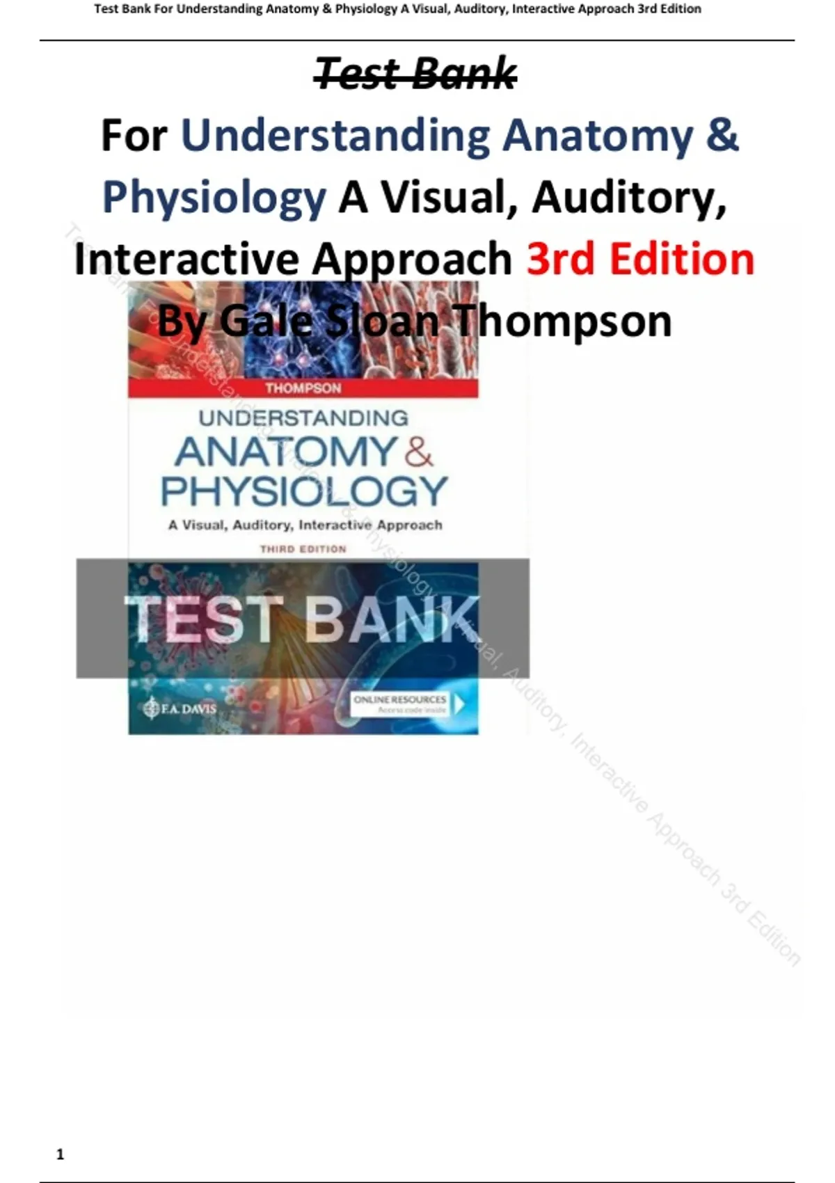 This document contains a test bank based on Understanding Anatomy & Physiology: A Visual, Auditory, Interactive Approach, 3rd Edition by Gale Sloan Thompson. It covers core anatomy and physiology concepts using questions aligned with visual, auditory, and interactive learning methods. The material is designed to support exam preparation and reinforce understanding of body systems and physiological processes.