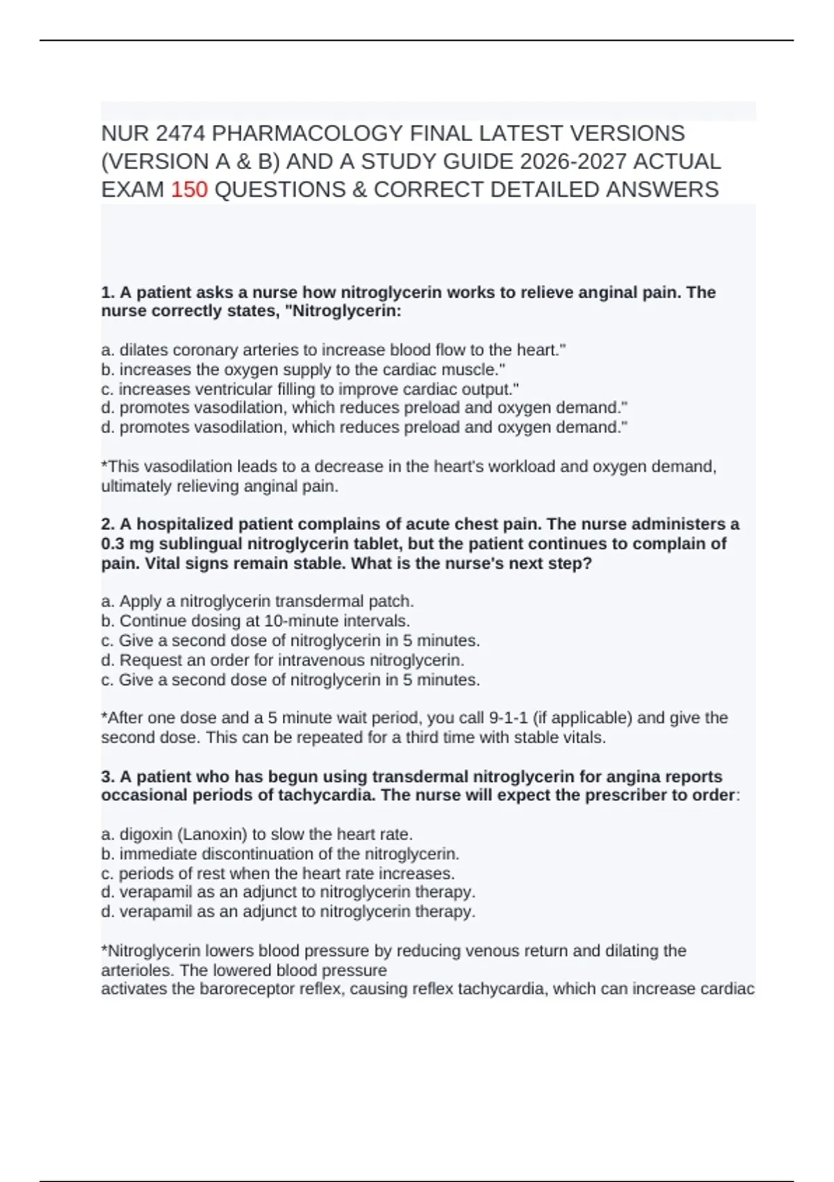 NUR 2474 PHARMACOLOGY FINAL LATEST VERSIONS (VERSION A & B) AND A STUDY GUIDE ACTUAL EXAM 150 QUESTIONS & CORRECT DETAILED ANSWERS ////NUR 2474 PHARMACOLOGY FINAL LATEST VERSIONS (VERSION A & B) AND A STUDY GUIDE ACTUAL EXAM 150 QUESTIONS & CORRECT DETAILED ANSWERS