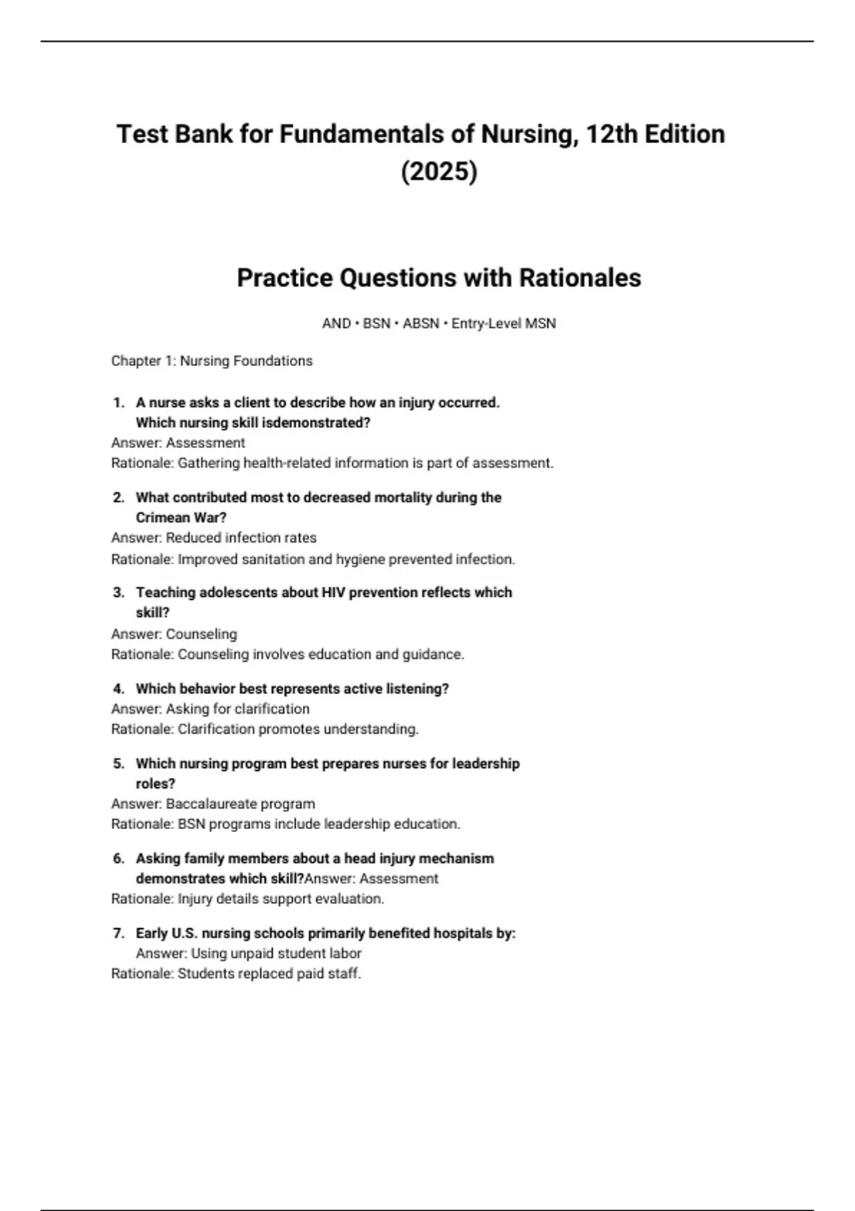 Chapter 1: Nursing Foundations 1. A nurse asks a client to describe how an injury occurred. Which nursing skill isdemonstrated? Answer: Assessment Rationale: Gathering health-related information is part of assessment. 2. What contributed most to decreased mortality during the Crimean War? Answer: Reduced infection rates Rationale: Improved sanitation and hygiene prevented infection. 3. Teaching adolescents about HIV prevention reflects which skill? Answer: Counseling Rationale: Counseling involves education and guidance.