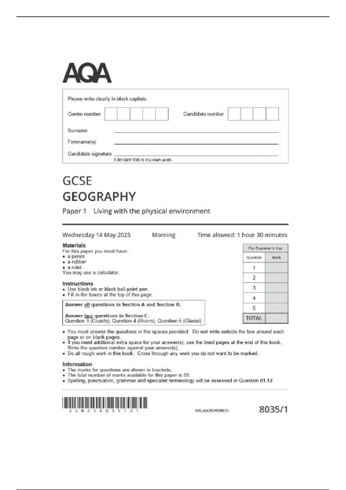 Living with the Physical Environment | AQA Paper 1 2025 (Merged with Mark Scheme)