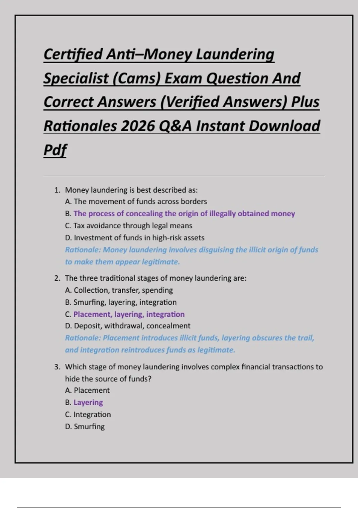 Certified Anti–Money Laundering Specialist (Cams) Exam Question And Correct Answers (Verified Answers) Plus Rationales 2026 Q&A Instant Download Pdf