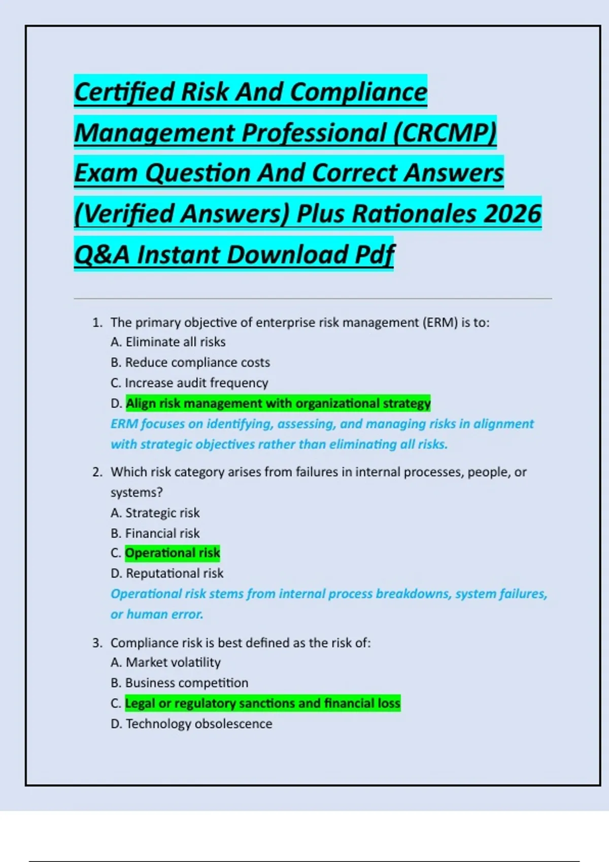 Certified Risk And Compliance Management Professional (CRCMP) Exam Question And Correct Answers (Verified Answers) Plus Rationales 2026 Q&A Instant Download Pdf