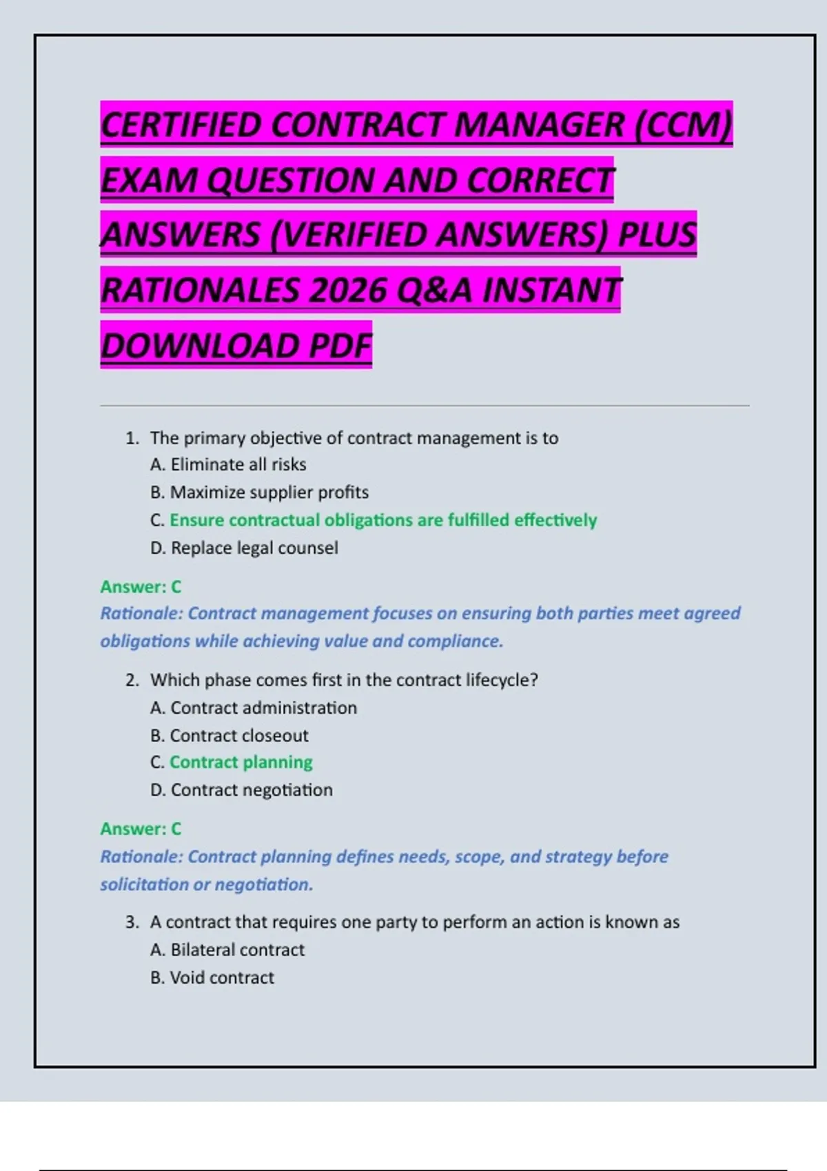 CERTIFIED CONTRACT MANAGER (CCM) EXAM QUESTION AND CORRECT ANSWERS (VERIFIED ANSWERS) PLUS RATIONALES 2026 Q&A INSTANT DOWNLOAD PDF