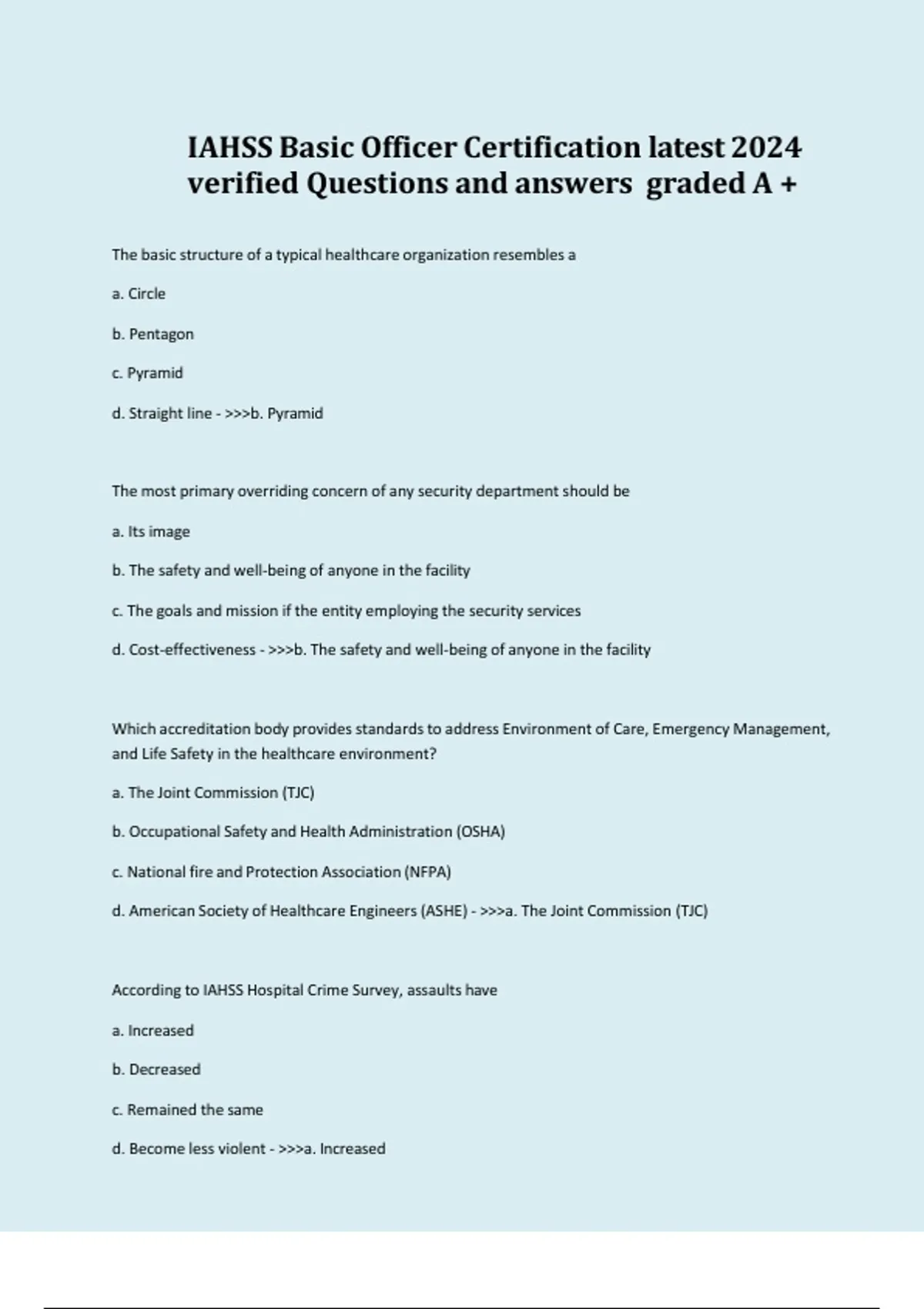 This comprehensive study resource covers the IAHSS Basic Officer Certification (BOC) Exam for the 2026/2027 certification cycle, featuring verified questions and accurate answers developed from historical IAHSS exam patterns, commonly searched healthcare security topics, and frequently tested concepts. The content includes patient and staff safety, security officer roles, emergency response, legal and ethical issues, access control, incident reporting, and workplace violence prevention. Ideal for healthcare security officers and professionals preparing for IAHSS BOC certification, recertification, remediation, or final review, this resource supports effective exam preparation through real exam-style questions and reliable explanations aligned with current IAHSS standards.