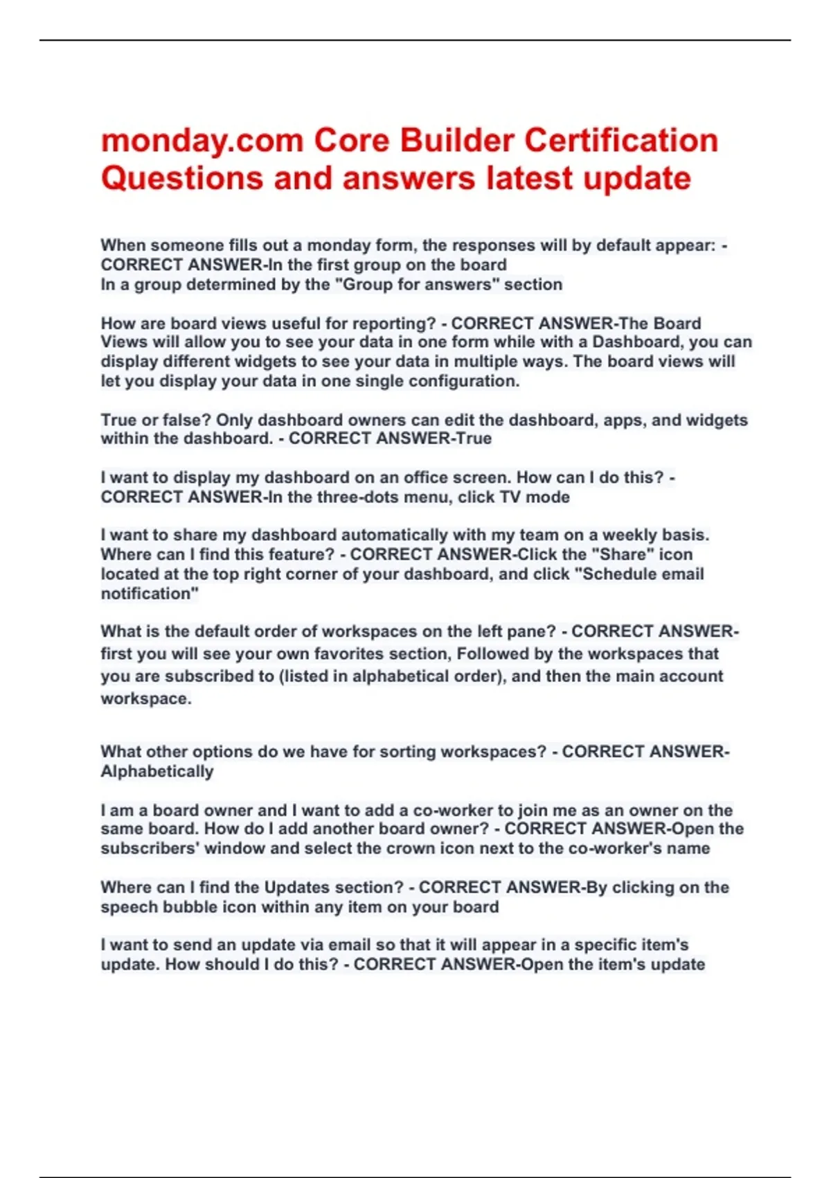 When someone fills out a monday form, the responses will by default appear: - CORRECT ANSWER-In the first group on the board In a group determined by the "Group for answers" section How are board views useful for reporting? - CORRECT ANSWER-The Board Views will allow you to see your data in one form while with a Dashboard, you can display different widgets to see your data in multiple ways. The board views will let you display your data in one single configuration. True or false? Only dashboard owners can edit the dashboard, apps, and widgets within the dashboard. - CORRECT ANSWER-True I want to display my dashboard on an office screen. How can I do this? - CORRECT ANSWER-In the three-dots menu, click TV mode I want to share my dashboard automatically with my team on a weekly basis. Where can I find this feature? - CORRECT ANSWER-Click the "Share" icon located at the top right corner of your dashboard, and click "Schedule email notification" What is the default order of workspaces on the left pane? - CORRECT ANSWERfirst you will see your own favorites section, Followed by the workspaces that you are subscribed to (listed in alphabetical order), and then the main account workspace. What other options do we have for sorting workspaces? - CORRECT ANSWERAlphabetically I am a board owner and I want to add a co-worker to join me as an owner on the same board. How do I add another board owner? - CORRECT ANSWER-Open the subscribers' window and select the crown icon next to the co-worker's name Where can I find the Updates section? - CORRECT ANSWER-By clicking on the speech bubble icon within any item on your board I want to send an update via email so that it will appear in a specific item's update. How should I do this? - CORRECT ANSWER-Open the item's updatesection click "Write updates via email" copy the item to clipboard paste as an email write the update in the email I have a board in the HR workspace but it belongs in the R&D Workspace. How do I move it? - CORRECT ANSWER-In the Workspace menu, right-click on the board name and choose the relevant Workspace to move it to How do you access content on a private board? - CORRECT ANSWER-Request the board owner to subscribe you to the private board