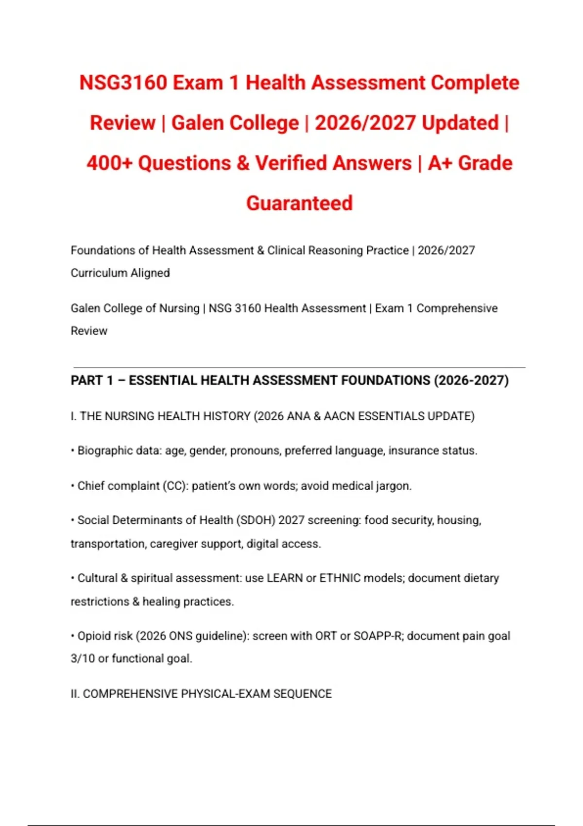 Galen College of Nursing | NSG 3160 Health Assessment | Exam 1 Comprehensive