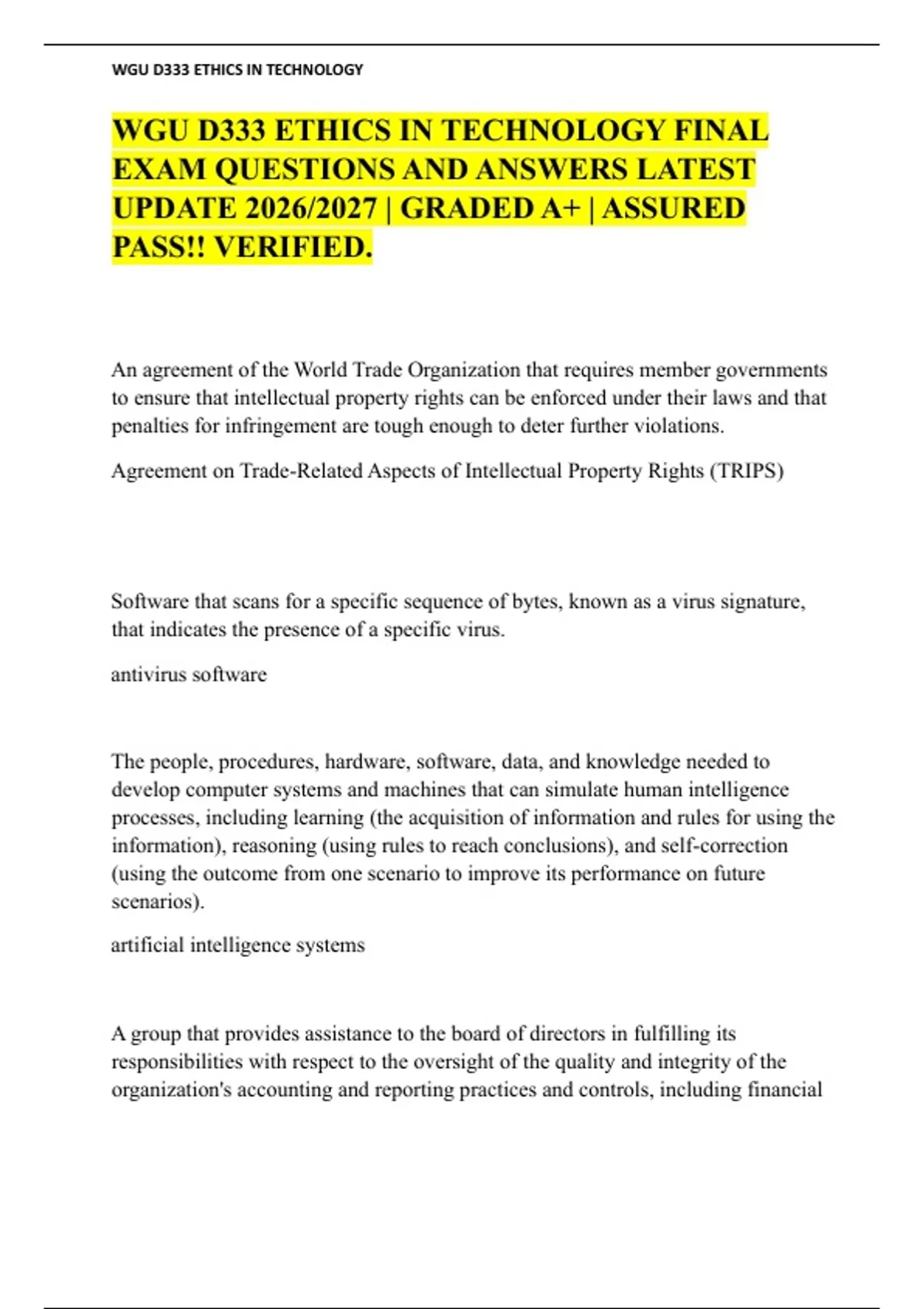 WGU D333 ETHICS IN TECHNOLOGY FINAL EXAM QUESTIONS AND ANSWERS LATEST UPDATE 2026/2027 | GRADED A+ | ASSURED PASS!! VERIFIED. An agreement of the World Trade Organization that requires member governments to ensure that intellectual property rights can be enforced under their laws and that penalties for infringement are tough enough to deter further violations. Agreement on Trade-Related Aspects of Intellectual Property Rights (TRIPS) Software that scans for a specific sequence of bytes, known as a virus signature, that indicates the presence of a specific virus. antivirus software The people, procedures, hardware, software, data, and knowledge needed to develop computer systems and machines that can simulate human intelligence processes, including learning (the acquisition of information and rules for using the information), reasoning (using rules to reach conclusions), and self-correction (using the outcome from one scenario to improve its performance on future scenarios). artificial intelligence systems A group that provides assistance to the board of directors in fulfilling its responsibilities with respect to the oversight of the quality and integrity of the organization's accounting and reporting practices and controls, including financial WGU D333 ETHICS IN TECHNOLOGY statements and reports; the organization's compliance with legal and regulatory requirements; the qualifications, independence, and performance of the company's independent auditor; and the performance of the company's internal audit team. audit committee The estimated loss from a potential risk event over the course of a year. The following equation is used to calculate the annual loss expectancy: ARO × SLE = ALE. Where ARO is the annualized rate of occurrence, an estimate of the probability that this event will occur over the course of a year and SLE is the single loss expectancy, the estimated loss that would be incurred if the event happens. annualized loss expectancy (ALE) An estimate of the probability that a risk event will occur over the course of a year. annualized rate of occurrence (ARO) The expression of opinions by people who do not reveal their identity. anonymous expression A service that allows anonymity on the Internet by using a computer program that strips the originating header and/or IP address from the message and then forwards the message to its intended recipient. anonymous remailer service WGU D333 ETHICS IN TECHNOLOGY Laws designed to reduce frivolous SLAPPs (strategic lawsuit against public participation (SLAPP), which is a lawsuit filed by corporations, government officials, and others against citizens and community groups who oppose them on matters of concern). anti-SLAPP laws A document that stipulates restrictions and practices that a user must agree in order to use organizational computing and network resources. acceptable use policy (AUP) A wide-ranging act that authorized $787 billion in spending and tax cuts over a 10year period and included strong privacy provisions for electronic health records, such as banning the sale of health information, promoting the use of audit trails and encryption, and providing rights of access for patients. American Recovery and Reinvestment Act When an organization decides to accept a risk because the cost of avoiding the risk outweighs the potential loss of the risk. A decision to accept a risk can be extremely difficult and controversial when dealing with safety-critical systems because making that determination involves forming personal judgments about the value of human life, assessing potential liability in case of an accident, evaluating the potential impact on the surrounding natural environment, and estimating the system's costs and benefits. acceptance A network attack in which an intruder gains access to a network and stays there— undetected—with the intention of stealing data over a long period of time (weeks or even months). advanced persistent threat (APT) WGU D333 ETHICS IN TECHNOLOGY A software development methodology in which a system is developed in iterations lasting from one to four weeks. Unlike the waterfall system development model, agile development accepts the fact that system requirements are evolving and cannot be fully understood or defined at the start of the project. agile development