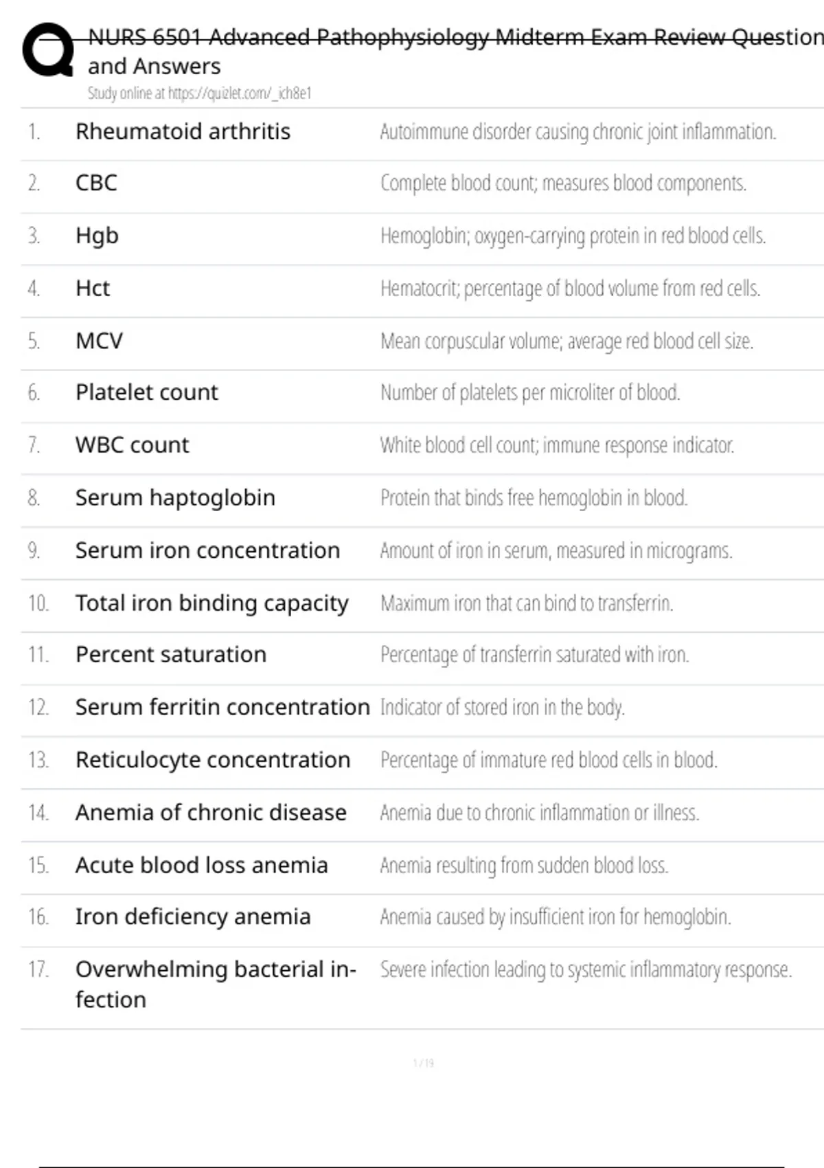 16. Iron deficiency anemia Anemia caused by insufficient iron for hemoglobin.