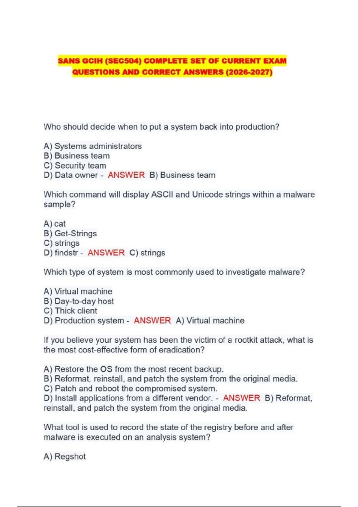SANS GCIH (SEC504) COMPLETE SET OF CURRENT EXAM QUESTIONS AND CORRECT ANSWERS ()