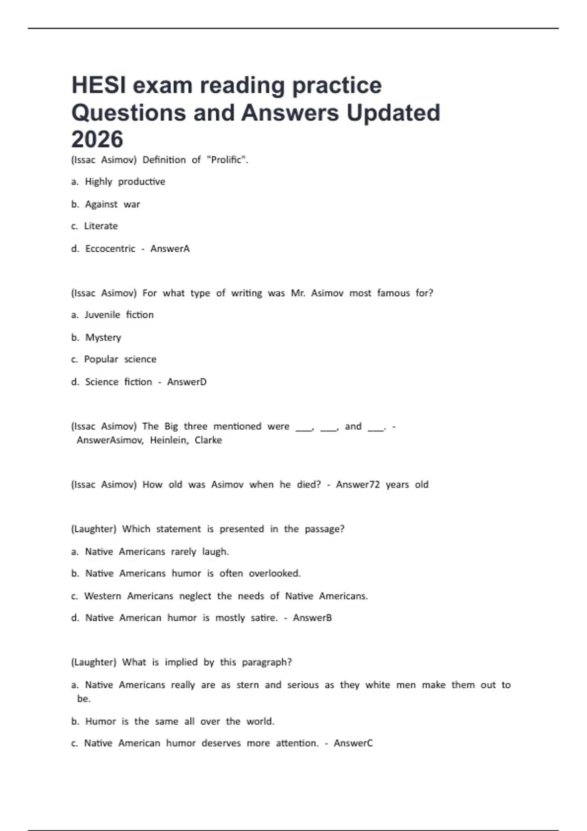 Summary HESI exam reading practice Questions and Answers Updated 2026