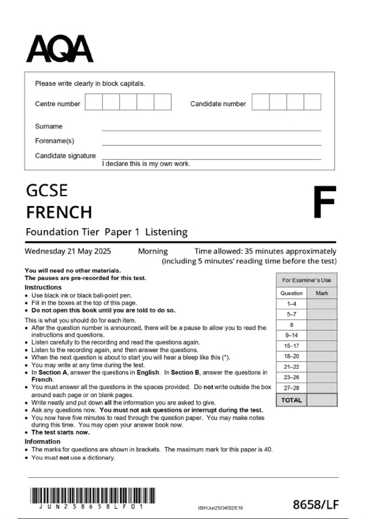 AQA Gcse French foundation tier 2025 paper 1 8658-LF Question Paper