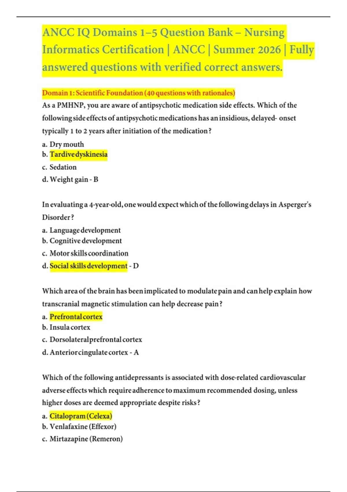 This document contains a complete ANCC Nursing Informatics (NI) IQ Domains 1–5 question bank, fully answered with all questions marked correctly for exam preparation. It covers systems lifecycle, data management, information systems, regulatory standards, leadership, and professional practice, updated to reflect the latest ANCC exam blueprint as of summer 2026.