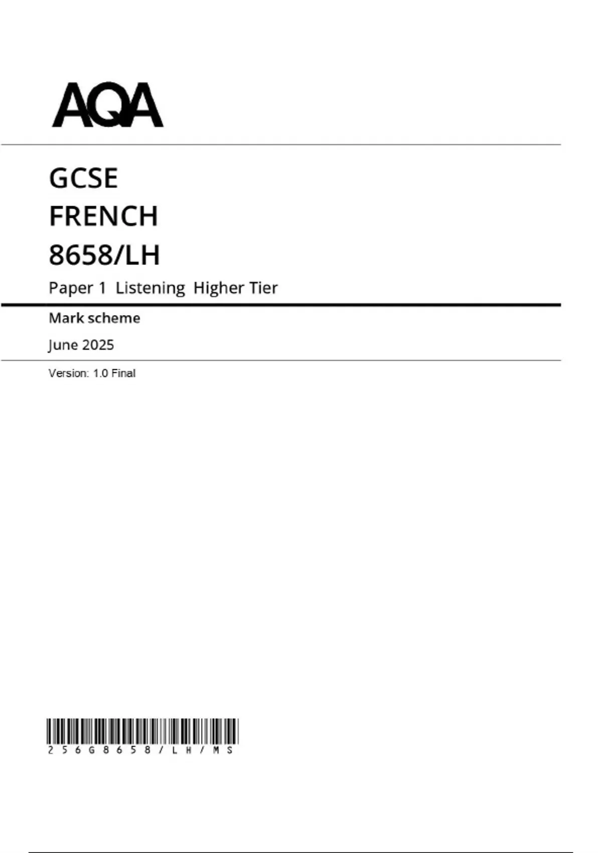 AQA Gcse French Higher tier 2025 paper 1 8658-LH Mark Scheme