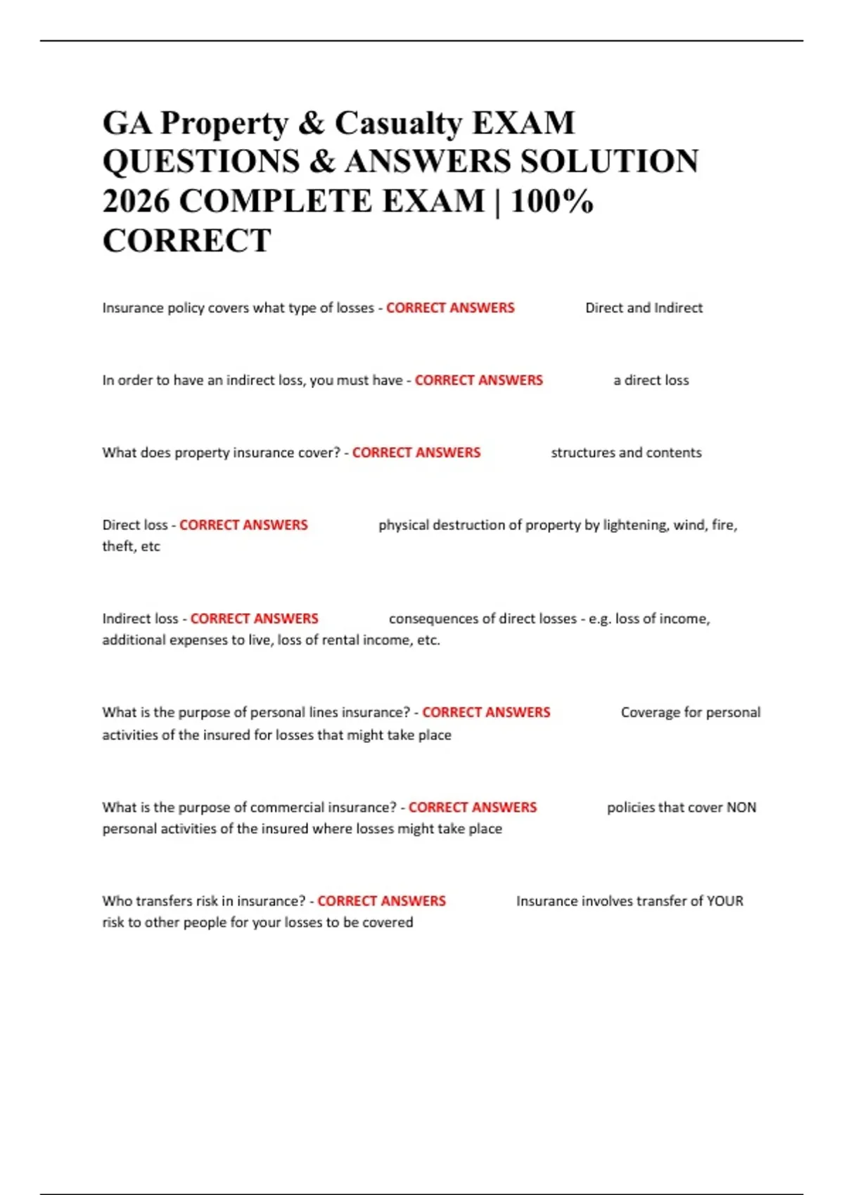GA Property & Casualty EXAM QUESTIONS & ANSWERS SOLUTION 2026 COMPLETE EXAM | 100% CORRECT