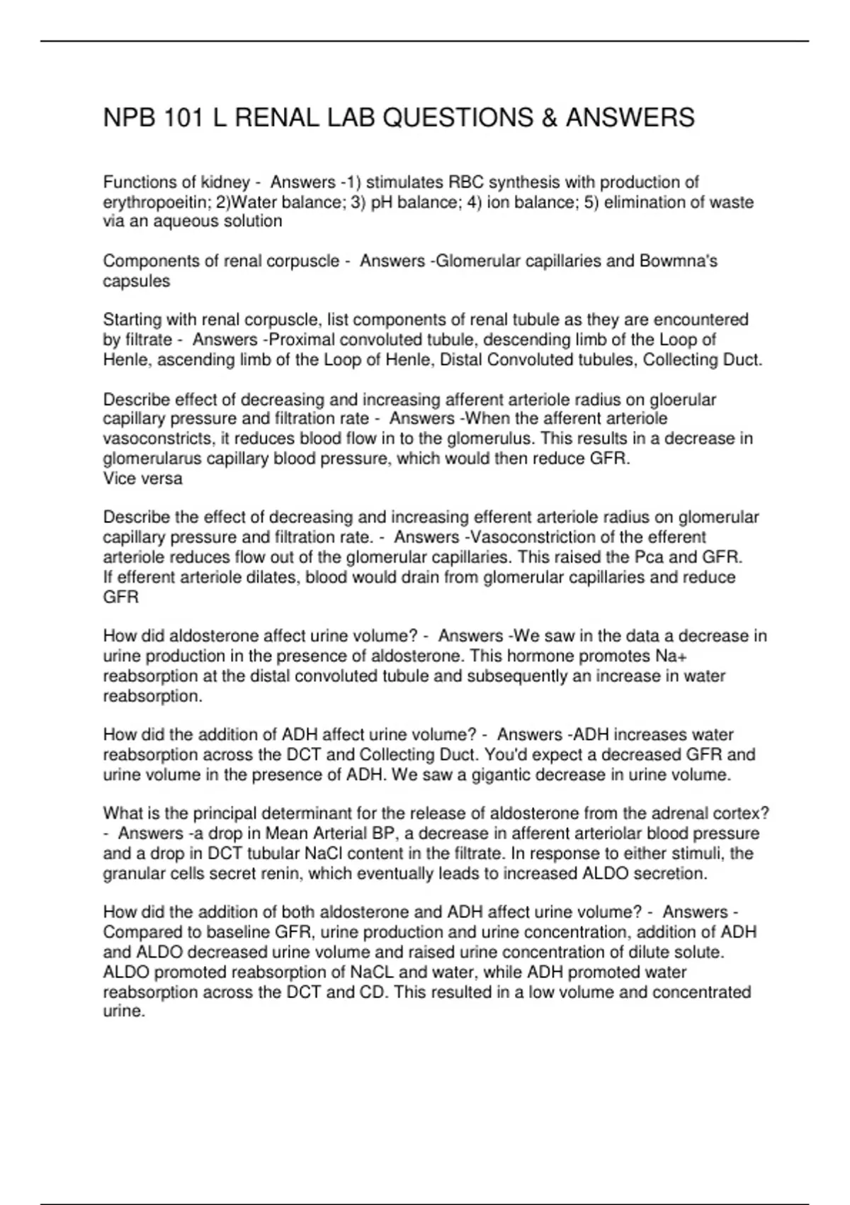 NPB 101 L RENAL LAB QUESTIONS & ANSWERS
