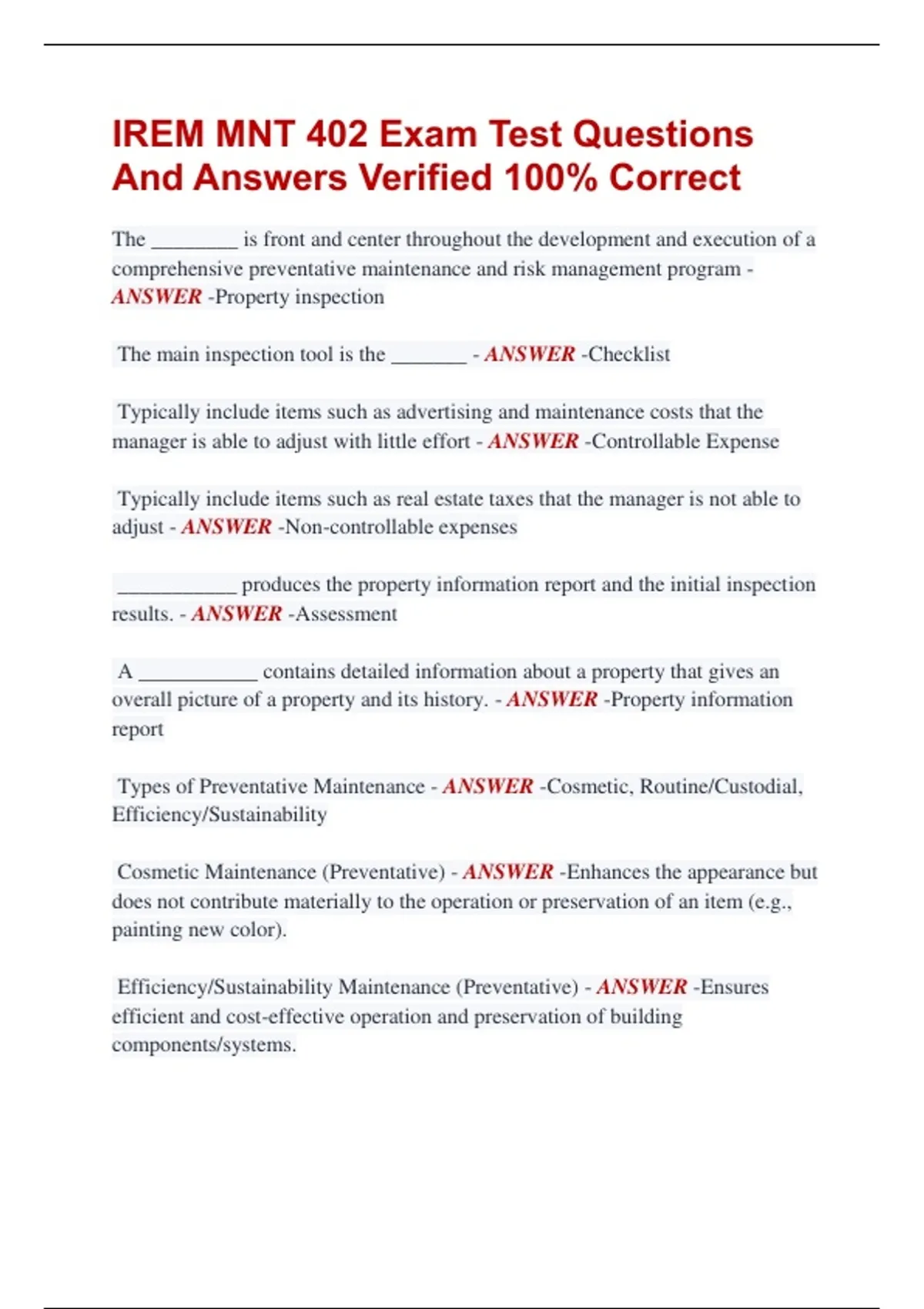 IREM MNT 402 Exam Test Questions And Answers Verified 100% Correct