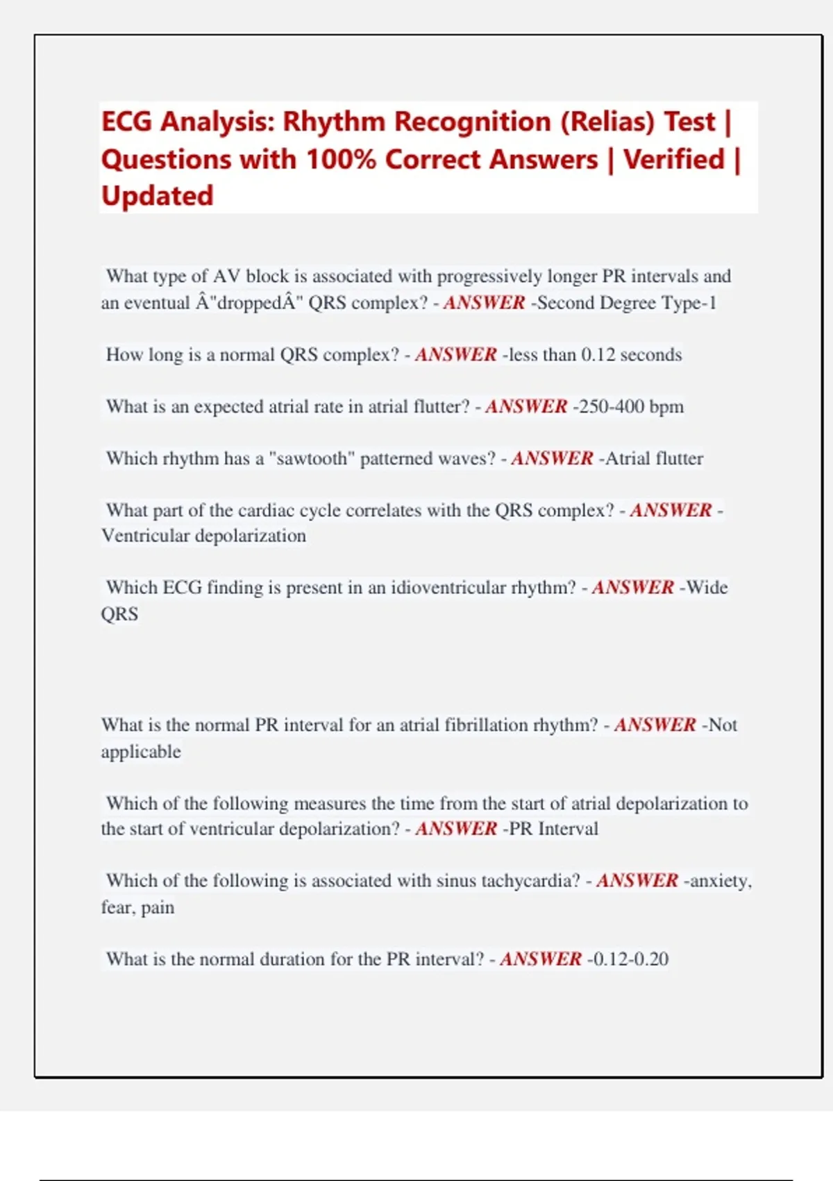 ECG Analysis: Rhythm Recognition (Relias) Test | Questions with 100% Correct Answers | Verified | Updated What type of AV block is associated with progressively longer PR intervals and an eventual Â"droppedÂ" QRS complex? - ANSWER -Second Degree Type-1 How long is a normal QRS complex? - ANSWER -less than 0.12 seconds What is an expected atrial rate in atrial flutter? - ANSWER -250-400 bpm Which rhythm has a "sawtooth" patterned waves? - ANSWER -Atrial flutter What part of the cardiac cycle correlates with the QRS complex? - ANSWER Ventricular depolarization Which ECG finding is present in an idioventricular rhythm? - ANSWER -Wide QRS What is the normal PR interval for an atrial fibrillation rhythm? - ANSWER -Not applicable Which of the following measures the time from the start of atrial depolarization to the start of ventricular depolarization? - ANSWER -PR Interval Which of the following is associated with sinus tachycardia? - ANSWER -anxiety, fear, pain What is the normal duration for the PR interval? - ANSWER -0.12-0.20 What is characteristic of standard ECG paper? - ANSWER -Comprised of small boxes measuring 0.04 seconds Which rhythm occurs when the atrial rate and ventricular rate occur independently? - ANSWER -Third Degree Block What is a characteristic of sinus bradycardia? - ANSWER -less than 60 bpm What part of the heart is the origin of an idioventricular rhythm? - ANSWER Ventricles What ECG rhythm has no discernible P waves, irregular fibrillatory waves, and an irregular R to R interval? - ANSWER -Atrial fibrillation What helps determine if a patient is Â"toleratingÂ" a rhythm? - ANSWER -Blood pressure and level of consciousness What part of the heart ejects blood into the aorta? - ANSWER -Left Ventricle When placing a 5 lead ECG on a patient, which lead would be placed on the right 4th intercostal space? - ANSWER -V True or False: Multifocal Atrial Tachycardia is caused by at least three ectopic atrial pacemakers and has a rate of greater than 100 beats per minute. - ANSWER True What is a potential cause of PVCs? - ANSWER -Hypokalemia