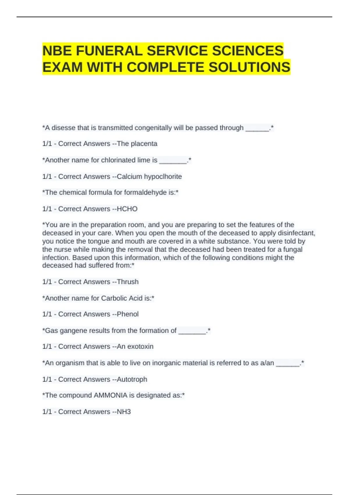 NBE FUNERAL SERVICE SCIENCES EXAM WITH COMPLETE SOLUTIONS