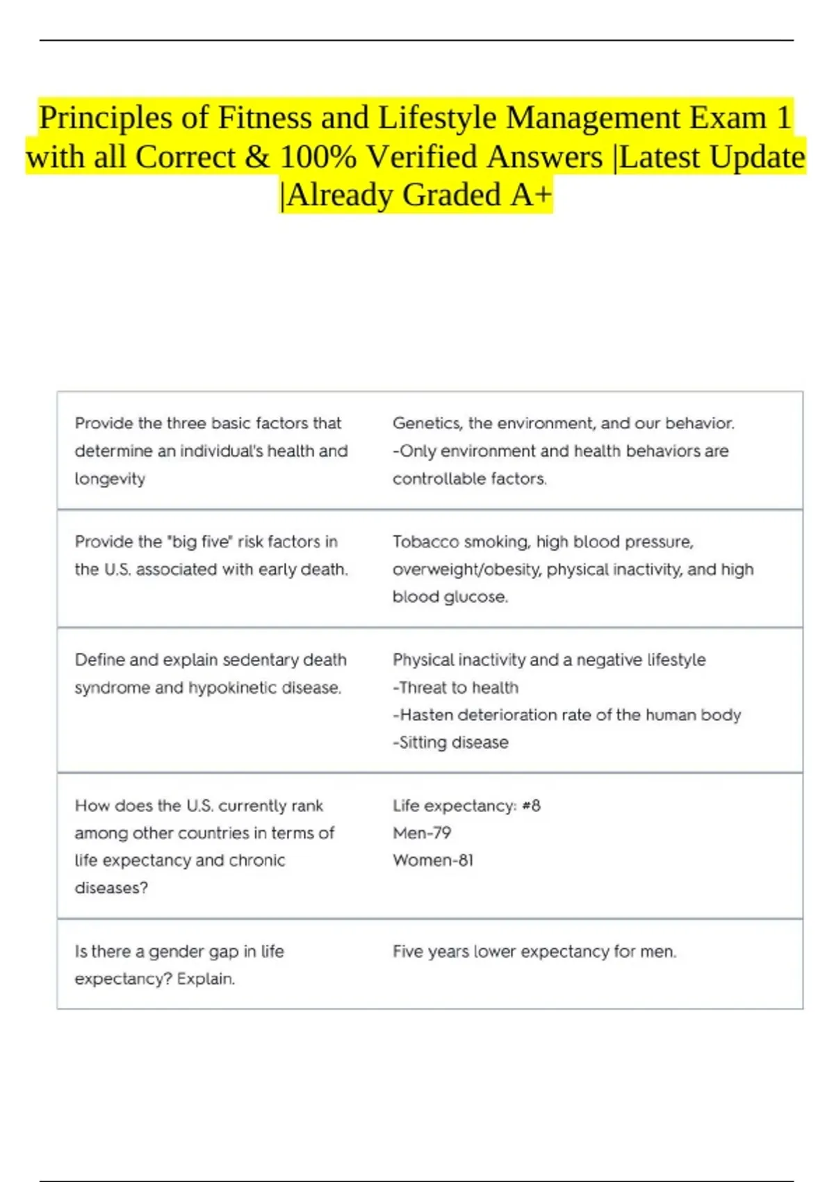 Principles of Fitness and Lifestyle Management Exam 1 with all Correct & 100% Verified Answers |Latest Update |Already Graded A+