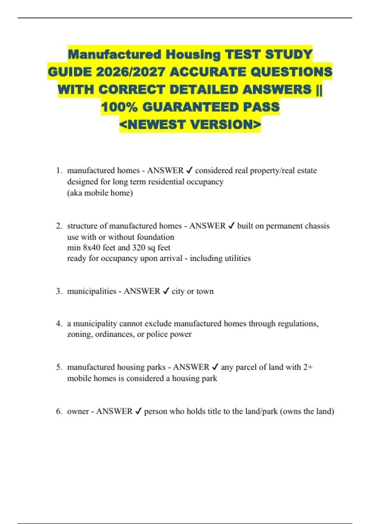 Manufactured Housing TEST STUDY GUIDE 2026/2027 ACCURATE QUESTIONS WITH CORRECT DETAILED ANSWERS || 100% GUARANTEED PASS <NEWEST VERSION>