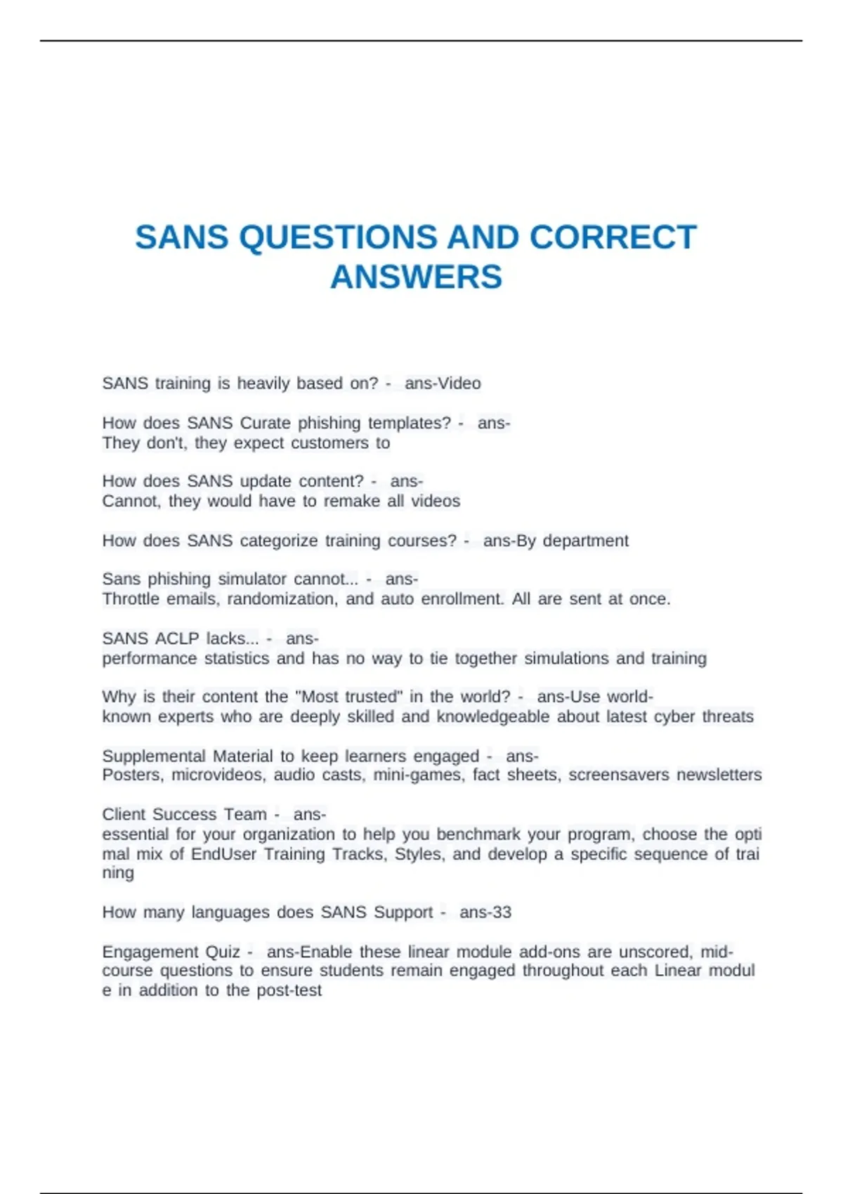SANS QUESTIONS AND CORRECT ANSWERS