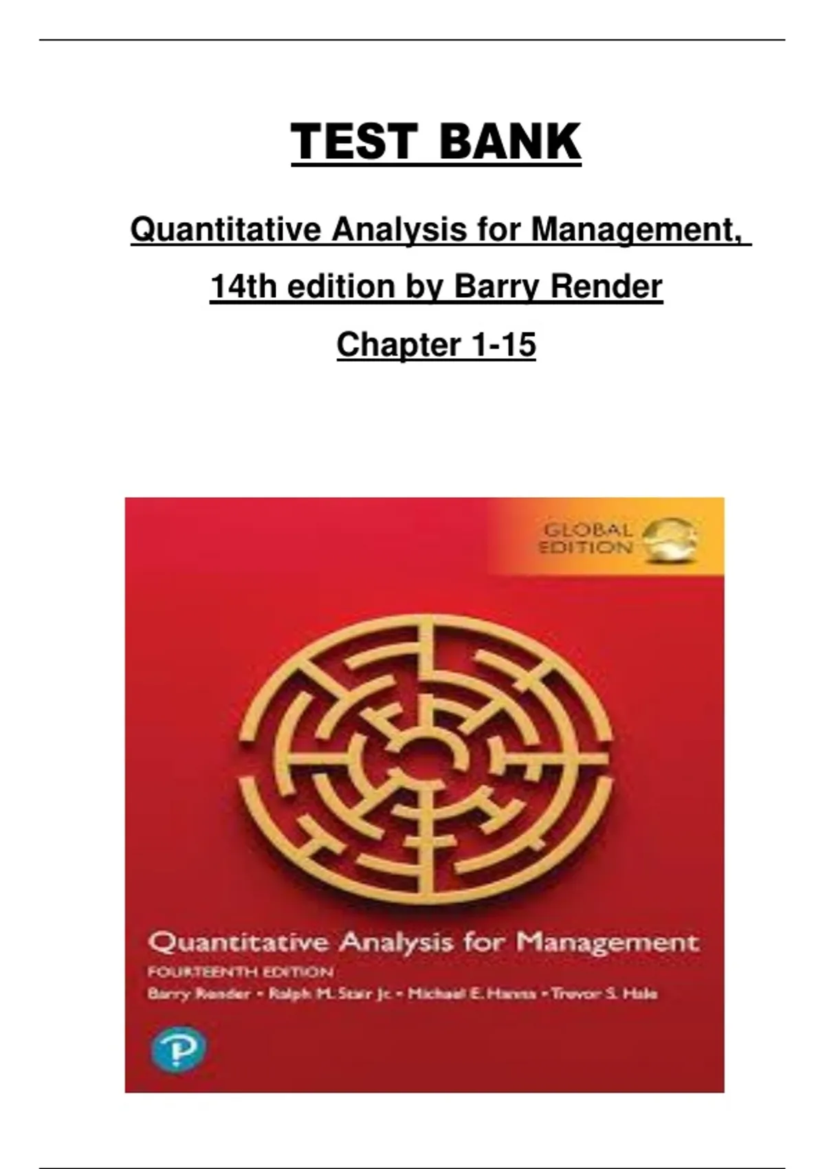 Quantitative Analysis for Management 14th Edition – Complete Test Bank (Chapters 1–15) by Barry Render This document is a comprehensive test bank based on Quantitative Analysis for Management, 14th Edition by Barry Render. It includes exam-style questions with revised and verified answers covering Chapters 1 through 15, focusing on quantitative decision-making tools such as linear programming, forecasting, decision analysis, inventory models, queuing theory, project management (PERT/CPM), simulation, and optimization techniques. The content is designed to support strong exam preparation and practical application of quantitative management concepts.