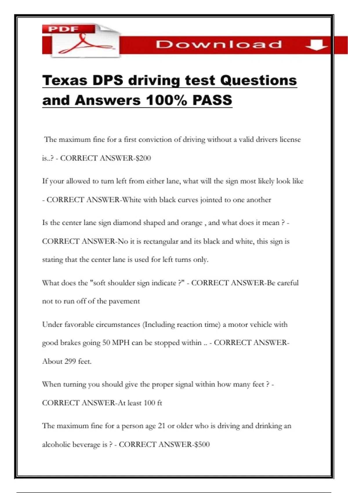 Texas DPS driving test Questions and Answers 100% PASS