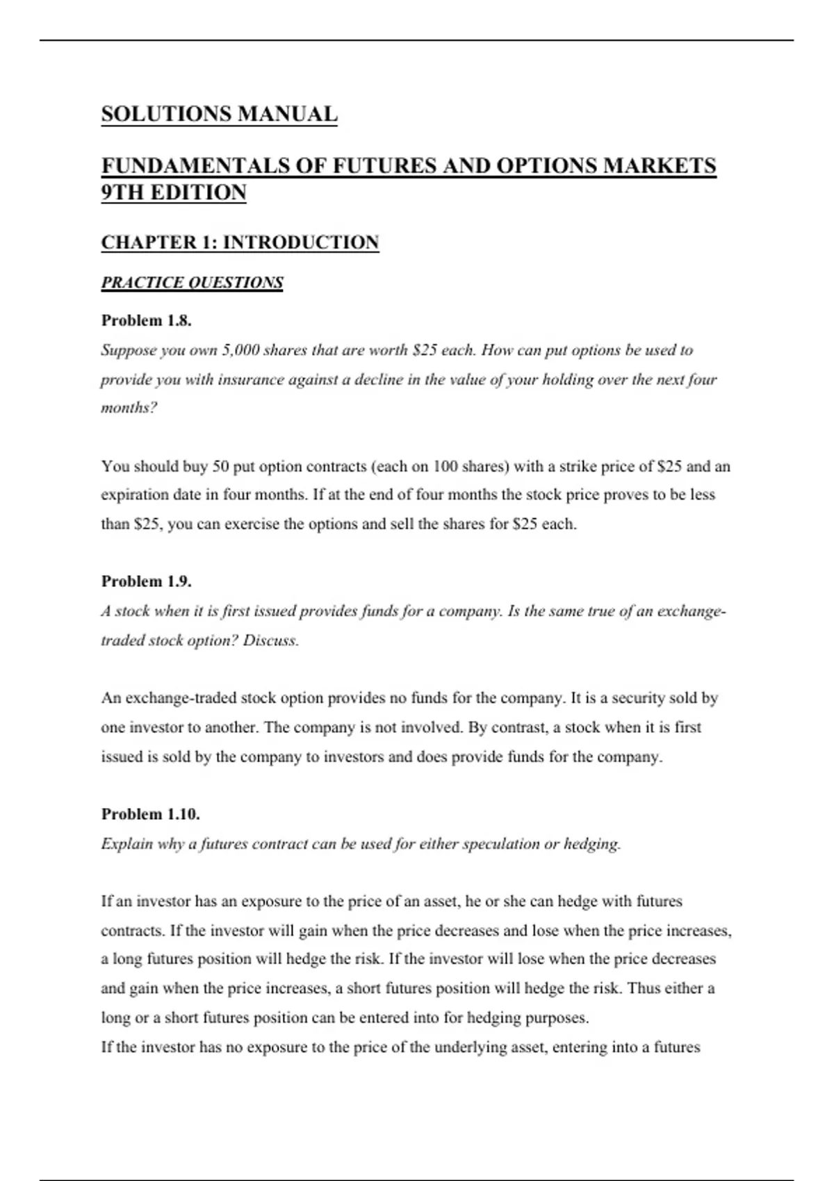 This document contains the complete solutions manual for Fundamentals of Futures and Options Markets, 9th Edition by John C. Hull, covering all end-of-chapter problems with clear, step-by-step explanations. It also includes instructor notes, Excel files, and solutions to extra practice problems, making it ideal for exam preparation, homework support, and teaching use. The material is fully aligned with the 9th edition textbook and is suitable for finance, economics, and derivatives courses at undergraduate and graduate level