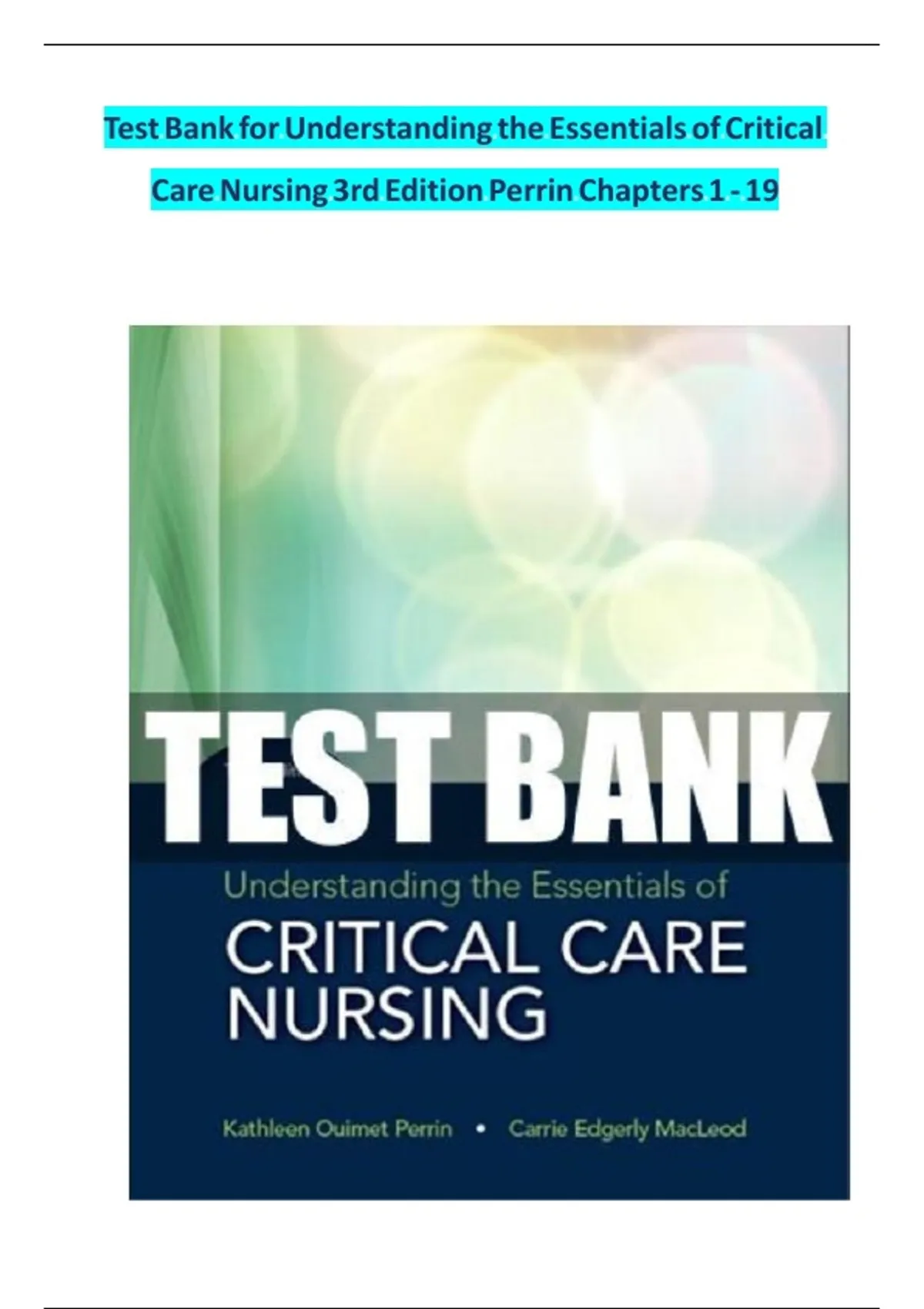 Download the complete test bank for Understanding the Essentials of Critical Care Nursing, 3rd Edition by Kathleen Ouimet Perrin and Carrie Edgerly MacLeod. This resource includes verified questions and rationales for Chapters 1-19, covering respiratory failure, hemodynamic regulation, shock, acute coronary syndrome, and sepsis management.