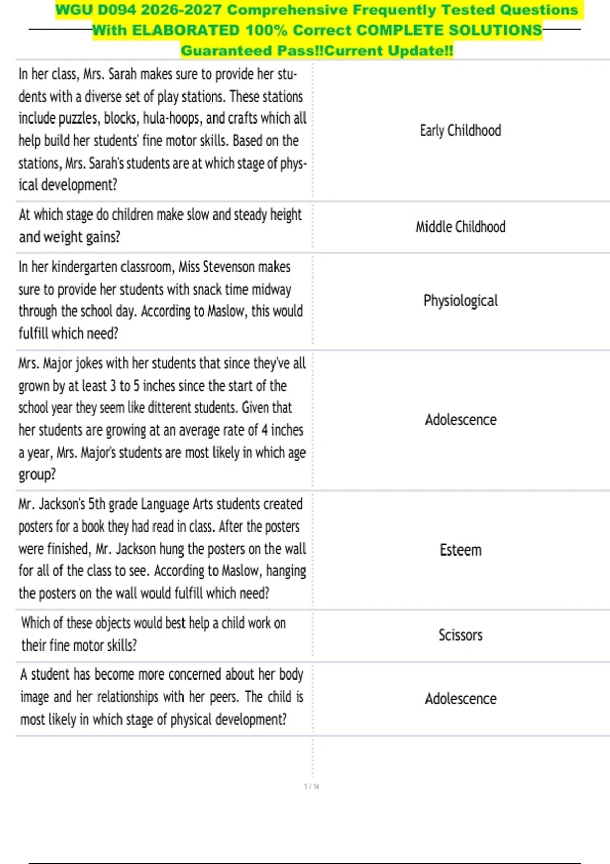 WGU D Comprehensive Frequently Tested Questions With ELABORATED 100% Correct COMPLETE SOLUTIONS Guaranteed Pass!!Current Update!! In her class, Mrs. Sarah makes sure to provide her students with a diverse set of play stations. These stations include puzzles, blocks, hula-hoops, and crafts which all help build her students' fine motor skills. Based on the stations, Mrs. Sarah's students are at which stage of physical development? Early Childhood In her kindergarten classroom, Miss Stevenson makes sure to provide her students with snack time midway through the school day. According to Maslow, this would fulfill which need? Physiological Mrs. Major jokes with her students that since they've all grown by at least 3 to 5 inches since the start of the school year they seem like ditterent students. Given that her students are growing at an average rate of 4 inches a year, Mrs. Major's students are most likely in which age group? Adolescence A student has become more concerned about her body image and her relationships with her peers. The child is most likely in which stage of physical development? Adolescence You notice Simone, a 24-month-old toddler, can easily run to the slide and climb up the ladder. An example of what you might say to encourage Simone in her physical development is: Wow- you ran really quickly to the slide and climbed up all three steps! Next time, would you like to try jumping to the slide?" A teacher provides students with a snack break every day at 10:00 am. Which need is the teacher trying to meet? Physiological During a teacher meeting, Mr. Gaston was discussing the gains his 5th-grade students had made this year in their handwriting. This suggests that his 5th-grade students are in which stage of physical development? middle childhood (9-11 years)