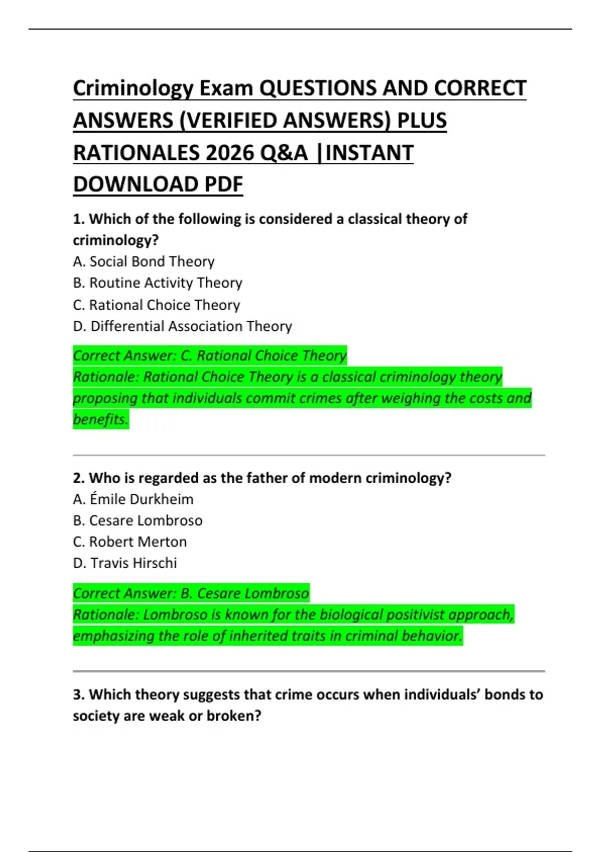 Criminology Exam Practice Questions and Correct Answers – Comprehensive Review Guide