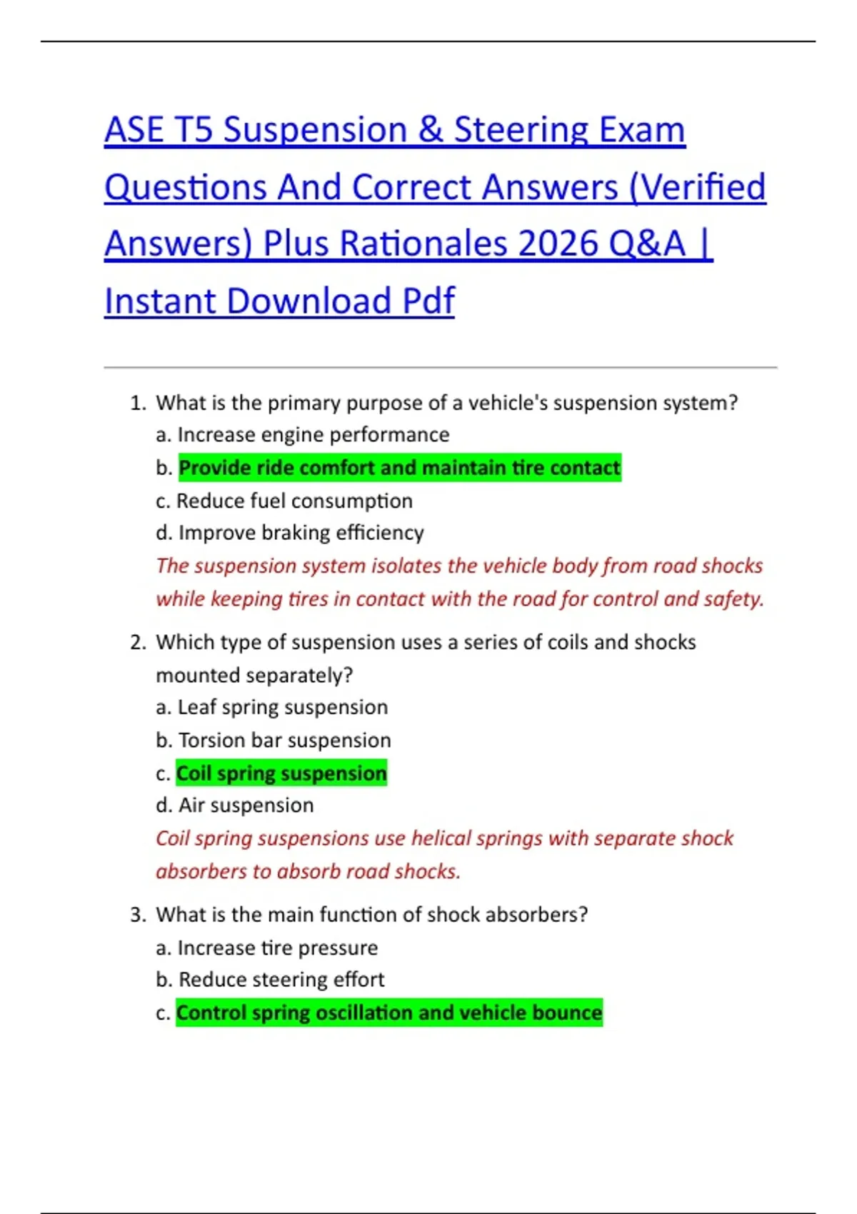 ASE T5 Suspension & Steering Exam Questions And Correct Answers (Verified Answers) Plus Rationales 2026 Q&A | Instant Download Pdf