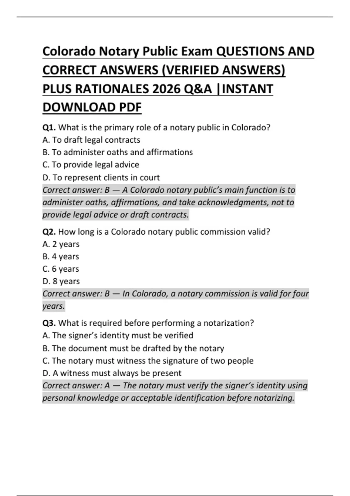This Colorado Notary Public Exam preparation guide includes up-to-date practice questions with correct, verified answers aligned with Colorado notary laws and regulations. It covers essential topics such as notarial acts, journal and recordkeeping requirements, identification standards, prohibited acts, and ethical responsibilities. Designed for first-time applicants and renewing notaries, this resource helps build confidence, ensure legal compliance, and improve exam success