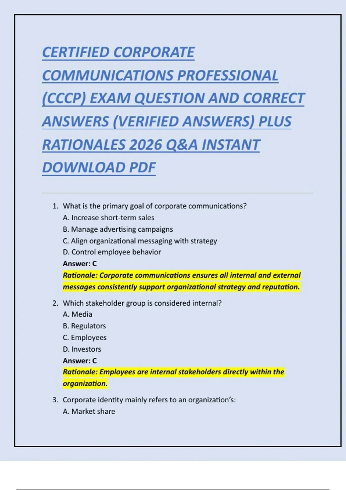 CERTIFIED CORPORATE COMMUNICATIONS PROFESSIONAL (CCCP) EXAM QUESTION AND CORRECT ANSWERS (VERIFIED ANSWERS) PLUS RATIONALES 2026 Q&A INSTANT DOWNLOAD PDF