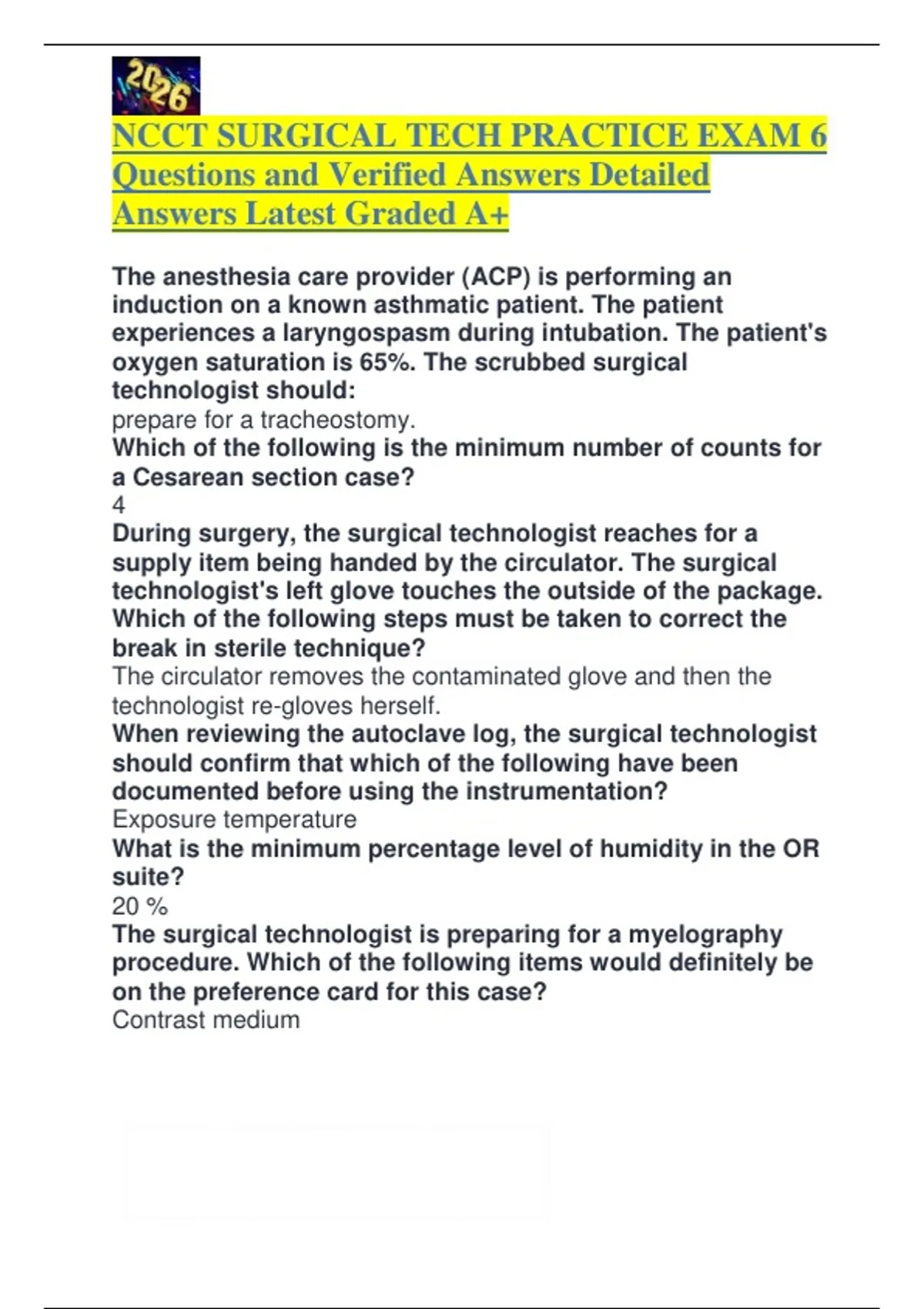 NCCT SURGICAL TECH PRACTICE EXAM 6 Questions and Verified Answers Detailed Answers Latest Graded