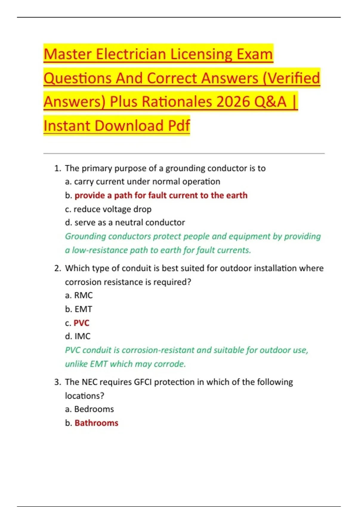 Master Electrician Licensing Exam Questions And Correct Answers (Verified Answers) Plus Rationales 2026 Q&A | Instant Download Pdf