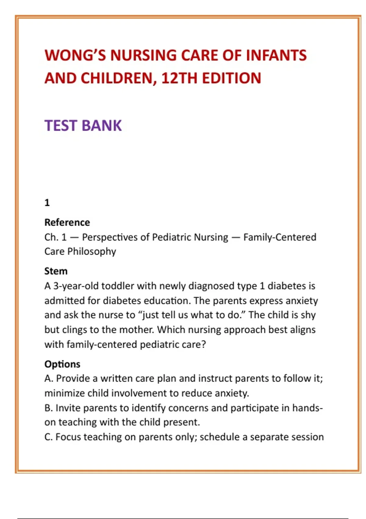 Wong’s Pediatric Nursing Test Bank 12th Edition | Hockenberry | Nursing Care of Infants & Children NCLEX-Style MCQs Description (200–300 words): Master pediatric nursing with confidence using this comprehensive digital Pediatric Nursing Test Bank based on Wong’s Nursing Care of Infants and Children, 12th Edition by Marilyn J. Hockenberry—the gold-standard pediatric nursing textbook used worldwide in BSN, ADN, and diploma nursing programs. This test bank delivers FULL textbook coverage across ALL units and chapters, with 20 high-quality NCLEX-style multiple-choice questions (MCQs) per chapter, each paired with clear, evidence-based rationales. Questions are written to mirror real NCLEX-RN® and NCLEX-PN® clinical judgment demands, emphasizing safe, age-appropriate, family-centered pediatric nursing care. Designed for time-efficient exam preparation, this resource strengthens pediatric assessment skills, growth and developmental milestone interpretation, medication safety, and prioritization of care for infants, children, and adolescents. Clinical scenarios integrate both acute and chronic pediatric conditions, helping learners distinguish “sick vs. not sick” children and make sound nursing decisions under exam pressure. Ideal for students enrolled in Pediatric Nursing, Child Health Nursing, Maternal–Child Health, and Family-Centered Care courses, this test bank also serves as a powerful companion for NCLEX-RN® and NCLEX-PN® preparation. Whether you are reinforcing classroom learning or preparing for licensure, this resource supports measurable score improvement and clinical confidence. Key Features: Complete chapter-by-chapter coverage of Wong’s 12th Edition 20 NCLEX-style MCQs per chapter with verified rationales Pediatric clinical reasoning, safety, and prioritization focus Growth & development, pediatric assessment, and medication safety Family-centered, evidence-based nursing interventions Digital format for flexible, on-the-go study Keywords (8): Wong pediatric nursing test bank Hockenberry pediatric nursing questions Nursing care of infants and children MCQs Pediatric nursing study guide Pediatric nursing NCLEX questions Maternal child nursing test bank Child health nursing MCQs Pediatric nursing exam preparation Hashtags (10): #PediatricNursing #WongsPediatricNursing #Hockenberry #NursingTestBank #ChildHealthNursing #MaternalChildHealth #NCLEXPrep #NursingStudents #PediatricNCLEX #NursingEducation