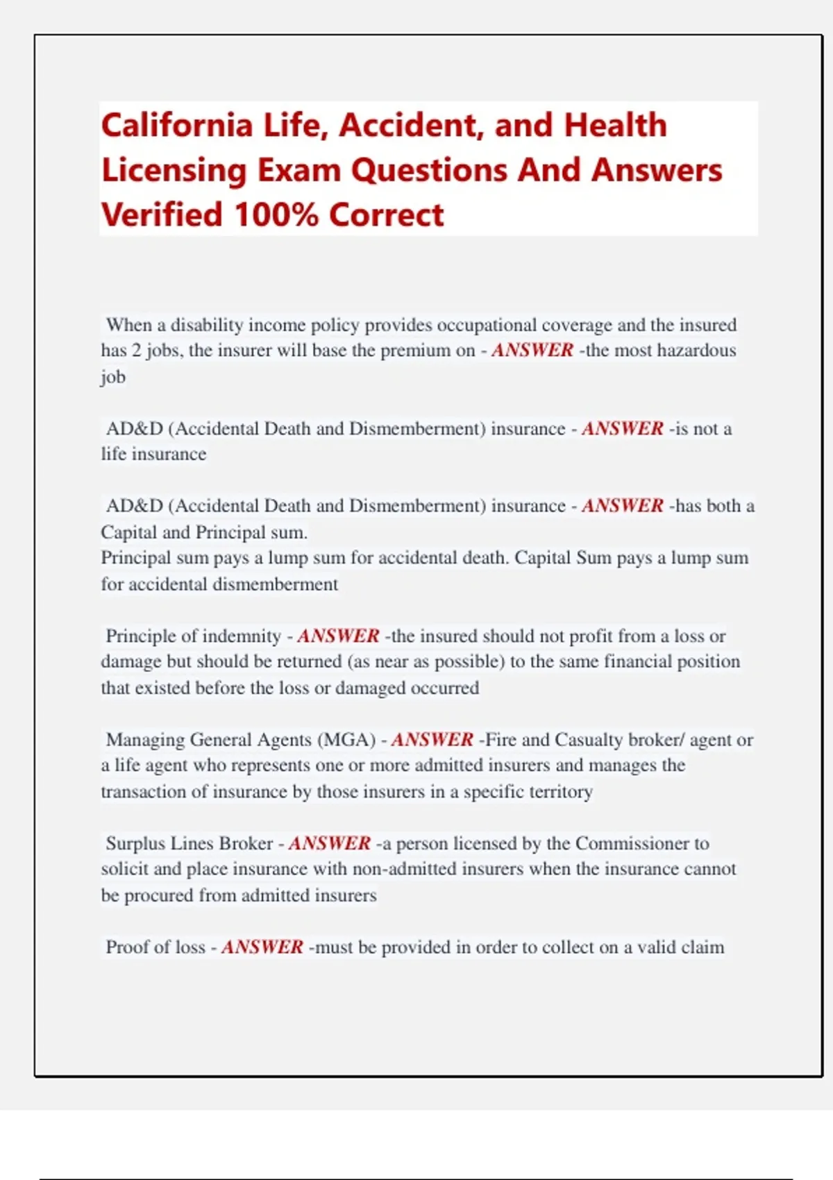 California Life, Accident, and Health Licensing Exam Questions And Answers Verified 100% Correct When a disability income policy provides occupational coverage and the insured has 2 jobs, the insurer will base the premium on - ANSWER -the most hazardous job AD&D (Accidental Death and Dismemberment) insurance - ANSWER -is not a life insurance AD&D (Accidental Death and Dismemberment) insurance - ANSWER -has both a Capital and Principal sum. Principal sum pays a lump sum for accidental death. Capital Sum pays a lump sum for accidental dismemberment Principle of indemnity - ANSWER -the insured should not profit from a loss or damage but should be returned (as near as possible) to the same financial position that existed before the loss or damaged occurred Managing General Agents (MGA) - ANSWER -Fire and Casualty broker/ agent or a life agent who represents one or more admitted insurers and manages the transaction of insurance by those insurers in a specific territory Surplus Lines Broker - ANSWER -a person licensed by the Commissioner to solicit and place insurance with non-admitted insurers when the insurance cannot be procured from admitted insurers Proof of loss - ANSWER -must be provided in order to collect on a valid claim In Group Health insurance, the period of time that starts when a new employee is hired and ends on the date they become eligible for the employer's Group Health plan - ANSWER -Probationary period Disability income policy covers - ANSWER -only loss of income due to disability, not medical expenses. Medical expense policies exclude coverage for losses resulting at work in order to reinforce the principle of indemnity, which states - ANSWER -the insured cannot recover more than they actually lost Equity indexed annuity - ANSWER -an annuity that has a fixed guaranteed minimum rate of return but has an excess rate of return which could also keep up with the performance of stock market Variable annuity - ANSWER -the owner of an annuity has to multiply the value of accumulation unit held in the separate account by the number of accumulation units owned In regards to an organizational license, what occurs when a corporation is dissolved - ANSWER -it is terminated Under the CIC, if a person refuses to submit books and records to the commissioner they would be guilty of - ANSWER -misdemeanor Characteristics of Ideally insurable risk - ANSWER -Loss must not be catastrophic in nature, must create economic hardship, must be definable. EXCEPT loss must be certain. Death is certain but it is okay because time of death is uncertain Coordination of benefits - ANSWER -the provision that applies in group insurance when an insured has coverage under multiple plans at one time Industrial life insurance has a face amount of - ANSWER -2000 or less Industrial life is sold by - ANSWER -debit insurance agents who call the clients in person on a weekly basis. Policies accrue a cash value. Premiums are paid weekly, the grace period is 28 days a supplementary benefit in a dread disease policy - ANSWER -Treatment, travel and lodging expenses when treatment is far from home, and normal living expenses such as a car payment, mortgage/rent and utility bills Medicare Supplement insurance policies - ANSWER -Insurers may offer plans that contain only the "core" benefits. (Plan A) There are 12 standardized Medicare Supplement policies, identified as - ANSWER -Plans A through L Medicare Supplements are sold by private insurers to supplement Medicare, which is generally only available to those who are at least age - ANSWER -65 In disability income insurance in order for bodily injury to be classife3d as accidental - ANSWER -the cause may be intentional but the result must be accidental Which of the following best illustrates the Principle of Indemnity - ANSWER Insurable Interest Factors used to underwrite group medical expense insurance policies - ANSWER the location of the group, term of the probationary period, the age and gender of those making up the group morbidity - ANSWER -the likelihood of illness or injury The minimum number of employees which must be covered in a group life insurance plan in California is - ANSWER -2 Persistency - ANSWER -the continued existence of a policy being in force.