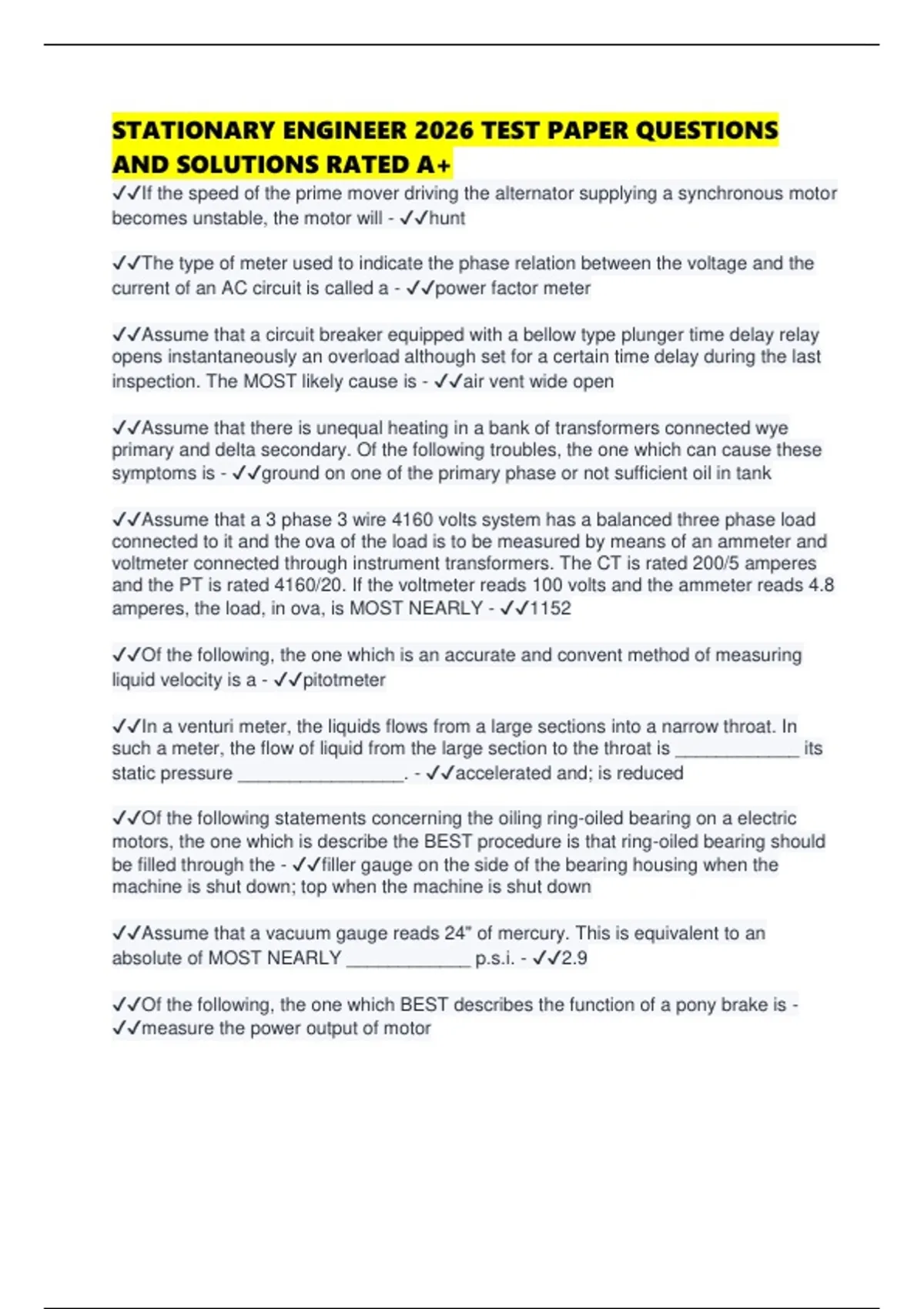 STATIONARY ENGINEER 2026 TEST PAPER QUESTIONS AND SOLUTIONS RATED A+