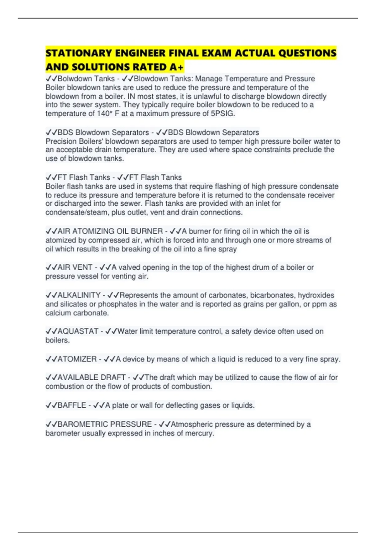 STATIONARY ENGINEER FINAL EXAM ACTUAL QUESTIONS AND SOLUTIONS RATED A+