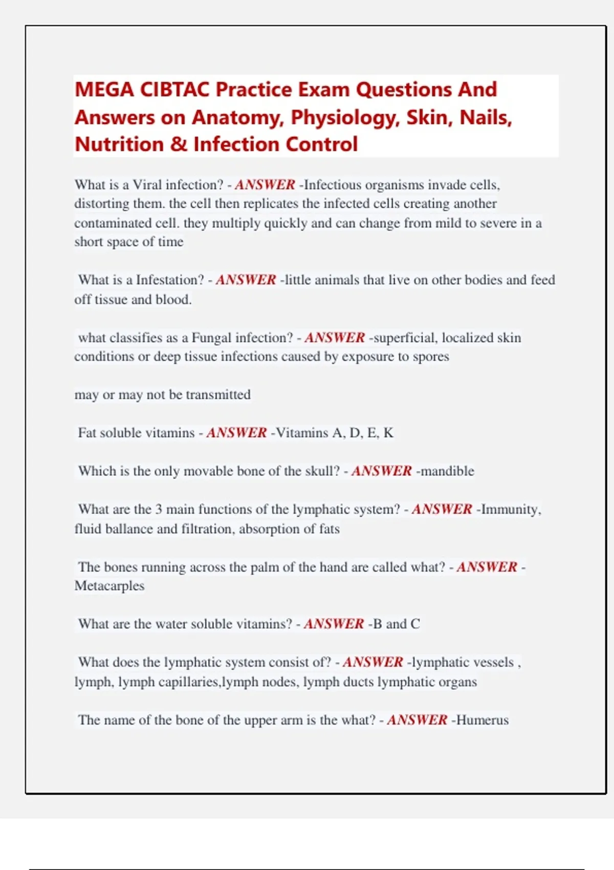 MEGA CIBTAC Practice Exam Questions And Answers on Anatomy, Physiology, Skin, Nails, Nutrition & Infection Control What is a Viral infection? - ANSWER -Infectious organisms invade cells, distorting them. the cell then replicates the infected cells creating another contaminated cell. they multiply quickly and can change from mild to severe in a short space of time What is a Infestation? - ANSWER -little animals that live on other bodies and feed off tissue and blood. what classifies as a Fungal infection? - ANSWER -superficial, localized skin conditions or deep tissue infections caused by exposure to spores may or may not be transmitted Fat soluble vitamins - ANSWER -Vitamins A, D, E, K Which is the only movable bone of the skull? - ANSWER -mandible What are the 3 main functions of the lymphatic system? - ANSWER -Immunity, fluid ballance and filtration, absorption of fats The bones running across the palm of the hand are called what? - ANSWER Metacarples What are the water soluble vitamins? - ANSWER -B and C What does the lymphatic system consist of? - ANSWER -lymphatic vessels , lymph, lymph capillaries,lymph nodes, lymph ducts lymphatic organs The name of the bone of the upper arm is the what? - ANSWER -Humerus Vitamins are what? - ANSWER -Essential nutrients that do not yield energy, but that are required for growth and proper functioning of the body. What is interstitial fluid? - ANSWER -Fluid BETWEEN the cells or in the tissues Minerals are what? - ANSWER -inorganic compounds needed in relatively small amounts for regulation, growth, and maintenance of body tissues and functions Which direction does lymph flow? - ANSWER -in one direction towards the heart The mentalis muscle is situated? - ANSWER -On the chin Lymphatic - ANSWER -Lymph and Lymph nodes protect against disease, transport fats and produce white blood cells. Endocrine System - ANSWER -Provides glands which produce hormones which regulate body functions like growth, reproduction and metabolism. Bioflavonoids - ANSWER -Referred to as vitamin P. Enhances absorption of vitamin C Relieve pain and bruises and helps injury's heal faster The right lymphatic duct empties lymph into the what? - ANSWER -Right subclavian vein What is Chyle? - ANSWER -lymph from the digestive system (more white in colour.) What does lymph contain? - ANSWER -Water, protein, white blood cells, fat, dead cell fragments, bacteria and toxins Mitosis takes place in which epidermal layer? - ANSWER -Basal Benefits of Vitamin K - ANSWER -essential for blood clotting Aids in healing especially in post cosmetic procedures Benefits of Vitamin F/ EFA - ANSWER -Building blocks of healthy cells Helps fight Acne AIDS absorption of active ingredients into deeper layers of skin Nerve ending are most numerous in which layer of skin? - ANSWER -Epidermal Where are lymphocytes produced? - ANSWER -bone marrow and thymus What are the main functions of lymph nodes? - ANSWER -Filtering the lymph fluid and activating the immune system The dermis is composed largely of what? - ANSWER -dense connective tissue Benefits of Vitamin C (ascorbic acid) - ANSWER -Antioxidant, Collagen production, collagen synthesis, anti inflammatory,Increases absorption of iron, copper, and chromium Benefits of Vitamin D - ANSWER -Aids growth of skin cells repair and metabolism Produced from UV on 7 dehydro-cholesterol on the skin What function is preformed by the sudoriferous glands? - ANSWER -Elimination of waste material though perspiration What are lymph capillaries? - ANSWER -Blind ended lymph vessels weaved along side the circulatory capillaries which contain one way flaps which allow interstitial fluid to flow into the lymphatic system What is Tinea Ungium? - ANSWER -Nail plate thickens and becomes deformed and finally sheds. Benefits of Vitamin E - ANSWER -Antioxidant, anti inflammatory reduces oedema and erythema soothing healing