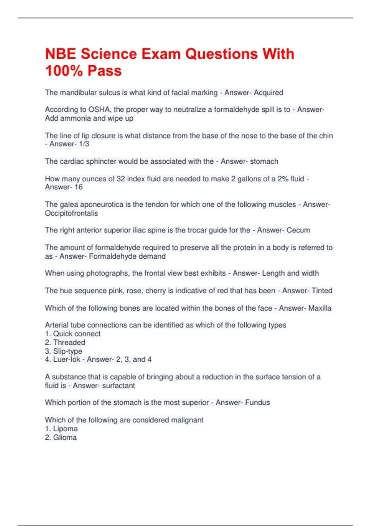 NBE Science Exam Questions With 100% Pass The mandibular sulcus is what kind of facial marking - Answer- Acquired According to OSHA, the proper way to neutralize a formaldehyde spill is to - Answer- Add ammonia and wipe up The line of lip closure is what distance from the base of the nose to the base of the chin - Answer- 1/3 The cardiac sphincter would be associated with the - Answer- stomach How many ounces of 32 index fluid are needed to make 2 gallons of a 2% fluid - Answer- 16 The galea aponeurotica is the tendon for which one of the following muscles - Answer- Occipitofrontalis The right anterior superior iliac spine is the trocar guide for the - Answer- Cecum The amount of formaldehyde required to preserve all the protein in a body is referred to as - Answer- Formaldehyde demand When using photographs, the frontal view best exhibits - Answer- Length and width The hue sequence pink, rose, cherry is indicative of red that has been - Answer- Tinted Which of the following bones are located within the bones of the face - Answer- Maxilla Arterial tube connections can be identified as which of the following types 1. Quick connect 2. Threaded 3. Slip-type 4. Luer-lok - Answer- 2, 3, and 4 A substance that is capable of bringing about a reduction in the surface tension of a fluid is - Answer- surfactant Which portion of the stomach is the most superior - Answer- Fundus Which of the following are considered malignant 1. Lipoma 2. Glioma 3. Lymphoma 4. Osteoma - Answer- 2 and 3 Formaldehyde in a dry powdered form is also known as - Answer- paraformaldehyde Intravascular blood discoloration is known as - Answer- Hypostasis Which of the following muscles is found in the lowest extremity - Answer- Sartorius Which of these will neutralize ptomaines - Answer- methanal The ovarian follicle is also known as - Answer- the graafian follicle The photo view which would best help restore a fractured zygomatic bone is - Answer- Anterior Bacteria in the blood that is not growing and multiplying is - Answer- bacteremia The deceased was in a motor vehicle accident accident. There are multiple fractures, facial abrasions, and deep lacerations on the face. Major restorative work is needed. Close the facial lacerations with which suture - Answer- Basketweave An organism that feeds on dead organic matter only is a - Answer- Strict Saphrophyte The anatomical guide that lies lateral to the tendon of the flexor carpi ulnaris muscle describes the - Answer- Ulnar artery An inflammatory condition related to the nervous system is - Answer- General paresis When attempting to locate the right axillary artery, the practitioner might facilitate the process by locating which of the following? 1. Hairline of the axilla 2. Medial border of coracobrachialis muscle 3. Belly of the biceps brachii muscle 4. Triceps brachii muscle - Answer- 1 and 2 only When closing the mouth, the line of lip closure resembles a classic hunting bow because it has - Answer- Three gently dipping curves What is the preferred treatment for eye enucleation - Answer- Remove packing, cauterize, insert prosthesis, cauterize To recreate pores in wax, use - Answer- A stipple brush In comparing cavity fluid to arterial fluid, the cavity fluid will have - Answer- No active dyes They differ from bacteria in that they are obligate parasites requiring living cells for growth, and differ from viruses in that they are retained by the Berkefield filter. They are - Answer- Rickettsia A malignant tumor derived principally from connective tissue is - Answer- Sarcoma Bleaching of blood discolorations may be done chemically by the use of all the following acids, except - Answer- Sulfuric Physiognomy is the study of - Answer- Face and features Which of the following is true of Creutzfelt-Jacob disease - Answer- It is always fatal Inflammation of the testes due to trauma, metastasis, mumps, or infection elsewhere in the body is called - Answer- Orchitis Restored eyelashes should have no hair extended from the extreme ends of the - Answer- Line of closure Those changes occurring in the interval prior to somatic death are - Answer- Antemortem What vein accompanies the common carotid artery - Answer- Internal jugular A body being prepared has an open wound in the cheek which is approx 1 1/2 inches in diameter and has no visible tissue in the hole. What kind of suture would be the best to use on this case - Answer- Basketweave In regards to the formaldehyde exposure level readings, the action level is - Answer- 0.5 ppm HCHO may react with water to form - Answer- Methylene glycol Hypo embalming a severed portion of the body would not include using - Answer- Paraformaldehyde Minerals that cause hard water also promotes - Answer- Blood clotting Which of the following is commonly caused by a coccus - Answer- Tuberculosis A common ingredient in an autopsy chemical is - Answer- Paraformaldehyde STEL for HCHO monitoring should be - Answer- 15 min Creamy, white, odorless purge from the nostrils is probably from the - Answer- Brain Long term uncontrolled diabetes mellitus frequently leads to - Answer- Atherosclerosis An increase in the number of leukocyes (above 10,000 per cu. Mm) in blood, and generally caused by the presence of infection and usually transient is called - Answer- leukocytosis Bacteria that grow in the absence or presence of free oxygen are known as - Answer- Facultative How many ounces of a 36 index fluid is needed to make one gallon of a 0.5% solution - Answer- 2 Solutions with the same osmotic pressure are - Answer- Isotonic The union of two arteries is called - Answer- anastomoses The seventh vertebrae in the neck region are called - Answer- Cervical Which of the following is the correct order of the layers of the stomach wall that the trocar must pass through when inserted into the stomach? 1. Muscularis 2. Serosa 3. Mucosa 4. Submucosa - Answer- 2, 1, 4, 3