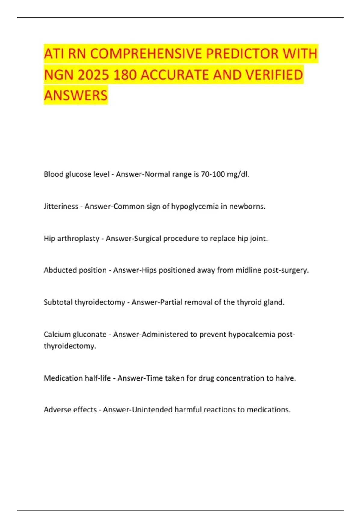 Blood glucose level - Answer-Normal range is 70-100 mg/dl. Jitteriness - Answer-Common sign of hypoglycemia in newborns. Hip arthroplasty - Answer-Surgical procedure to replace hip joint. Abducted position - Answer-Hips positioned away from midline post-surgery. Subtotal thyroidectomy - Answer-Partial removal of the thyroid gland.