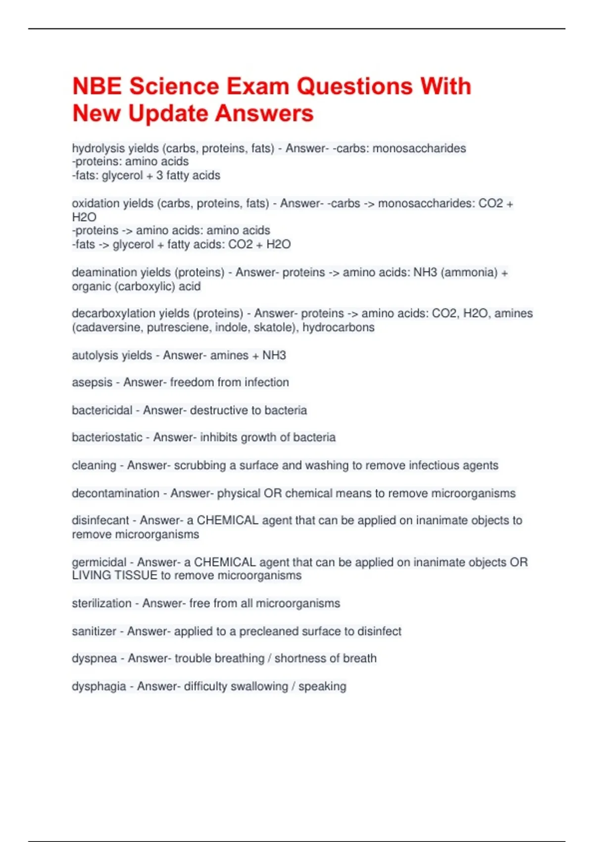 NBE Science Exam Questions With New Update Answers hydrolysis yields (carbs, proteins, fats) - Answer- -carbs: monosaccharides -proteins: amino acids -fats: glycerol + 3 fatty acids oxidation yields (carbs, proteins, fats) - Answer- -carbs -> monosaccharides: CO2 + H2O -proteins -> amino acids: amino acids -fats -> glycerol + fatty acids: CO2 + H2O deamination yields (proteins) - Answer- proteins -> amino acids: NH3 (ammonia) + organic (carboxylic) acid decarboxylation yields (proteins) - Answer- proteins -> amino acids: CO2, H2O, amines (cadaversine, putresciene, indole, skatole), hydrocarbons autolysis yields - Answer- amines + NH3 asepsis - Answer- freedom from infection bactericidal - Answer- destructive to bacteria bacteriostatic - Answer- inhibits growth of bacteria cleaning - Answer- scrubbing a surface and washing to remove infectious agents decontamination - Answer- physical OR chemical means to remove microorganisms disinfecant - Answer- a CHEMICAL agent that can be applied on inanimate objects to remove microorganisms germicidal - Answer- a CHEMICAL agent that can be applied on inanimate objects OR LIVING TISSUE to remove microorganisms sterilization - Answer- free from all microorganisms sanitizer - Answer- applied to a precleaned surface to disinfect dyspnea - Answer- trouble breathing / shortness of breath dysphagia - Answer- difficulty swallowing / speaking cachexia - Answer- wasting away tachycardia - Answer- fast heart rate polydipsia - Answer- excessive thirst dipsia - Answer- thirst TWA - Answer- 8 hours STEL - Answer- 15 minutes TWA action level and PEL - Answer- -action level: .5-.749999ppm -PEL: .75ppm+ STEL action level and PEL - Answer- -action level: none -PEL: 2ppm frederick ruysh - Answer- father of embalming, discovered arterial embalming gabriel clauderus - Answer- embalming without evisceration william hunter - Answer- documented as first arterial embalmer -- used femoral artery john hunter - Answer- hunters canal named after him jean gannal - Answer- wrote first book on embalming - the history of embalming - and helped prohibit the use of arsenic in embalming solutions marcello malpighi - Answer- father of microscopic anatomy / histology, discovered capillaries antony van leeuwenhoek - Answer- father of bacteriology and founded the microscope william harvey - Answer- circulation of blood dr thomas holmes - Answer- father of modern embalming dr richard burr - Answer- why there are more regulations for licensing embalmers henry catell - Answer- embalmed lincoln prince greer - Answer- first black embalmer august renouard - Answer- wrote the first textbook on embalming - the undertaker's manual albert worsham - Answer- postmortem plastic surgery joel crandall - Answer- systematic treatment / restorative art samuel rodgers - Answer- invented the trocar order of decomposition - Answer- carbs, soft proteins, fats, hard proteins, bones order of decomposition (body parts) - Answer- -larynx/trachea lining -infant brain -heart -pregnant uterus -non-pregnant uterus -eyes -soft tissues -hard tissues -blood vessels coronary circulation begins in the ____ and ends in the ______ - Answer- LV, RA systemic circulation begins in the ____ and ends in the ______ - Answer- LV, RA pulmonary circulation begins in the ____ and ends in the ______ - Answer- RV, LA crematory class of waste/incinerator - Answer- -level 4 waste -class 6 incinerator chordae tendinea - Answer- fibrous cords that attach the tricuspid/biscuspid/atrioventricular valves to PAPILLARY muscles in ventricles papillary muscles - Answer- cone shaped muscles in ANTERIOR ventricles traveculae carneae - Answer- ridges by IRREGULAR FOLDS of myocardium in anterior ventricle