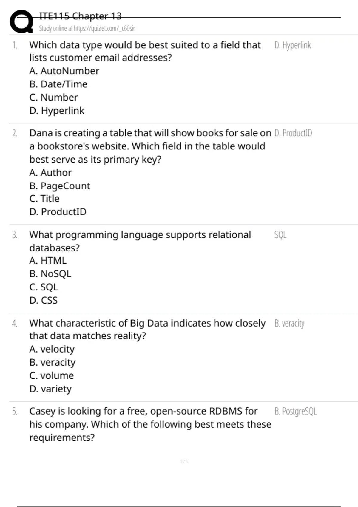 5. Casey is looking for a free, open-source RDBMS for B. PostgreSQL