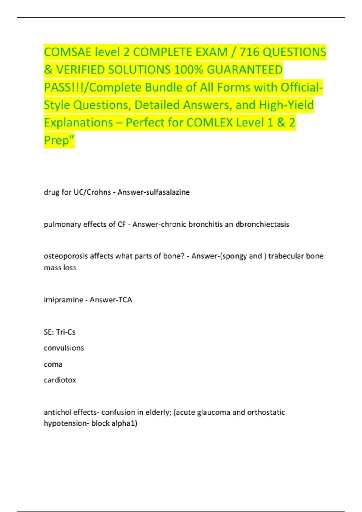 COMSAE level 2 COMPLETE EXAM / 716 QUESTIONS & VERIFIED SOLUTIONS 100% GUARANTEED PASS!!!/Complete Bundle of All Forms with OfficialStyle Questions, Detailed Answers, and High-Yield Explanations – Perfect for COMLEX Level 1 & 2 Prep”