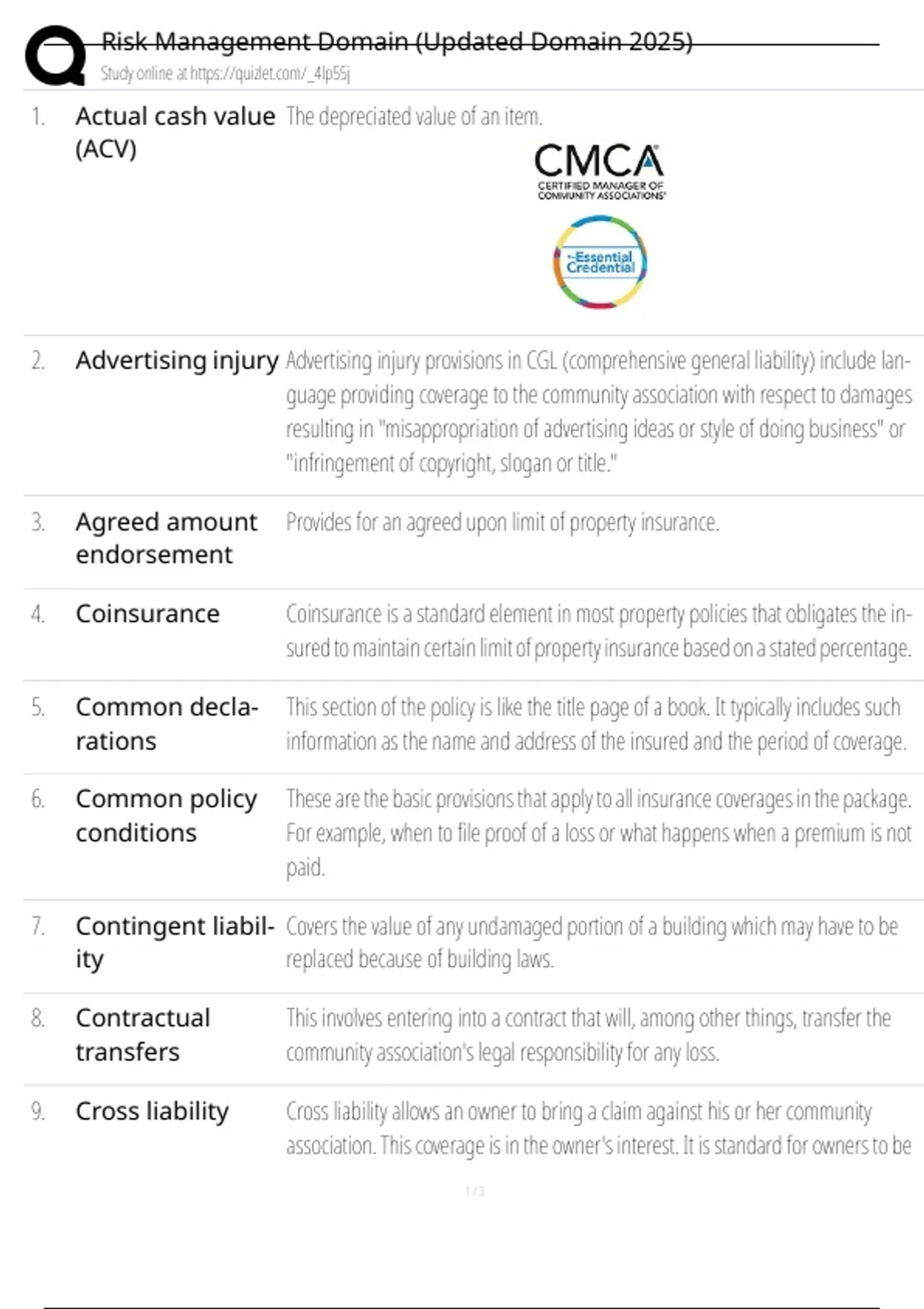 Actual cash value (ACV) The depreciated value of an item. 2. Advertising injury Advertising injury provisions in CGL (comprehensive general liability) include lan- guage provid