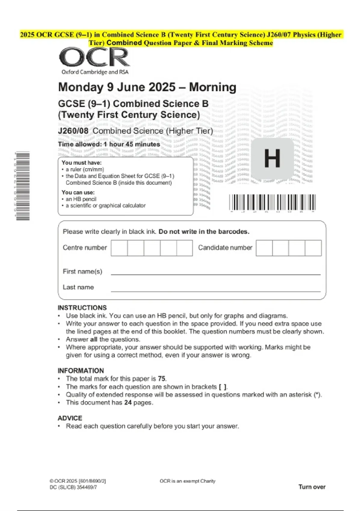 2025 OCR GCSE (9–1) in Combined Science B (Twenty First Century Science) J260/07 Physics (Higher Tier) Examination Paper and Final Marking Scheme