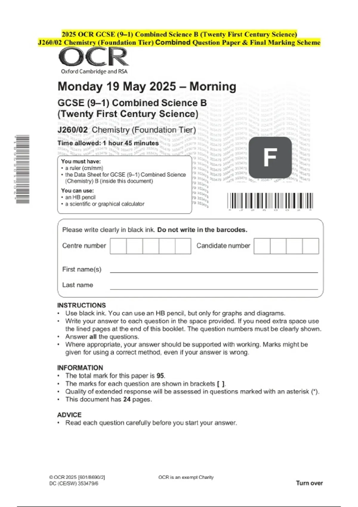 2025 OCR GCSE (9–1) Combined Science B (Twenty First Century Science) J260/02 Chemistry (Foundation Tier) Examination Paper and Final Marking Scheme
